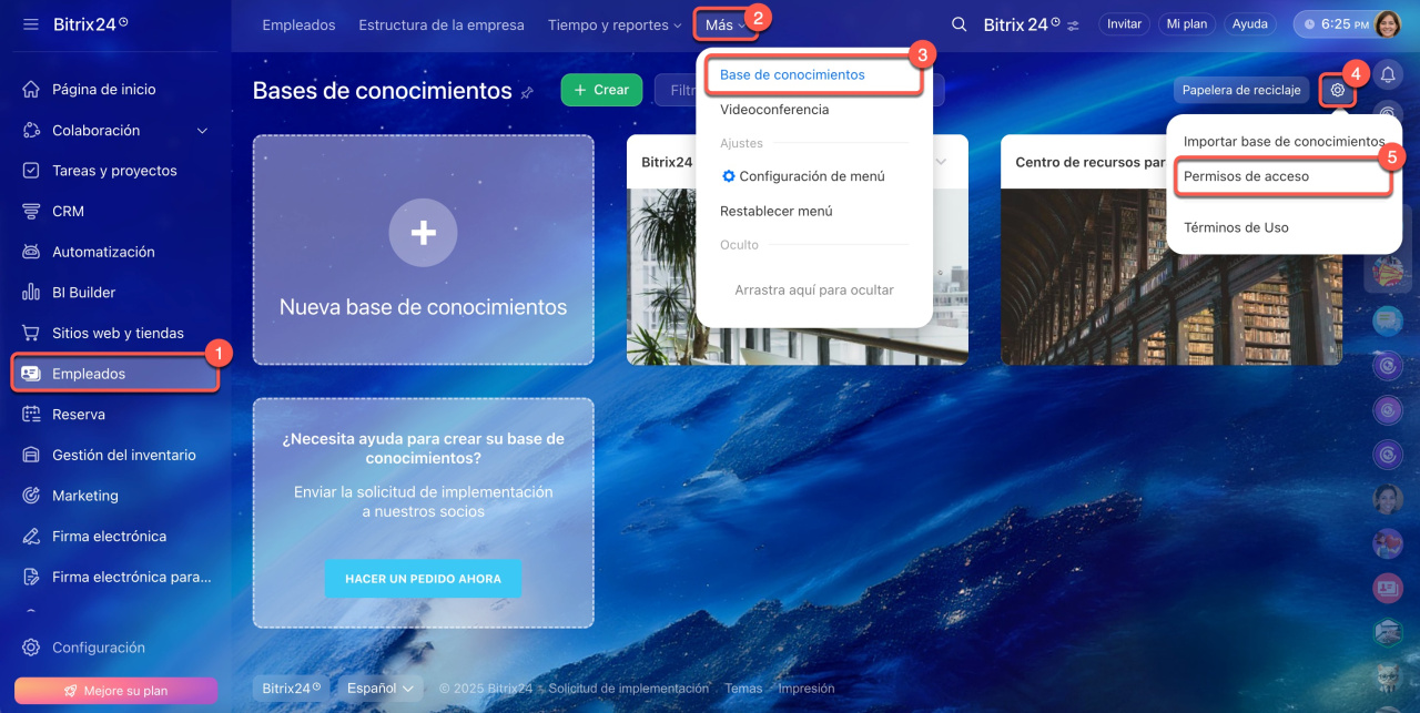1-5. Accede a Empleados > Más > Base de conocimientos > Configuración (⚙️) > Permisos de acceso.