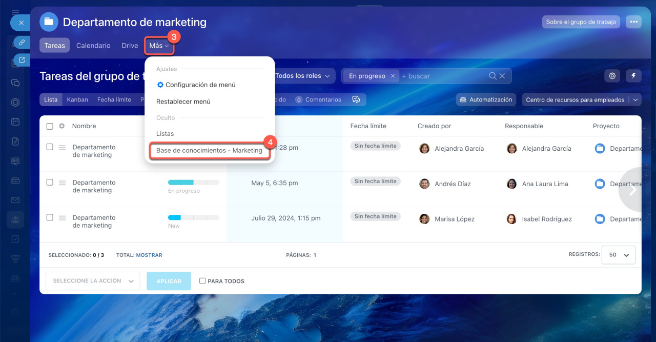 - En grupos y proyectos: ve a Grupos de trabajo, selecciona el grupo deseado y en el menú superior haz clic en Más > Base de conocimientos.