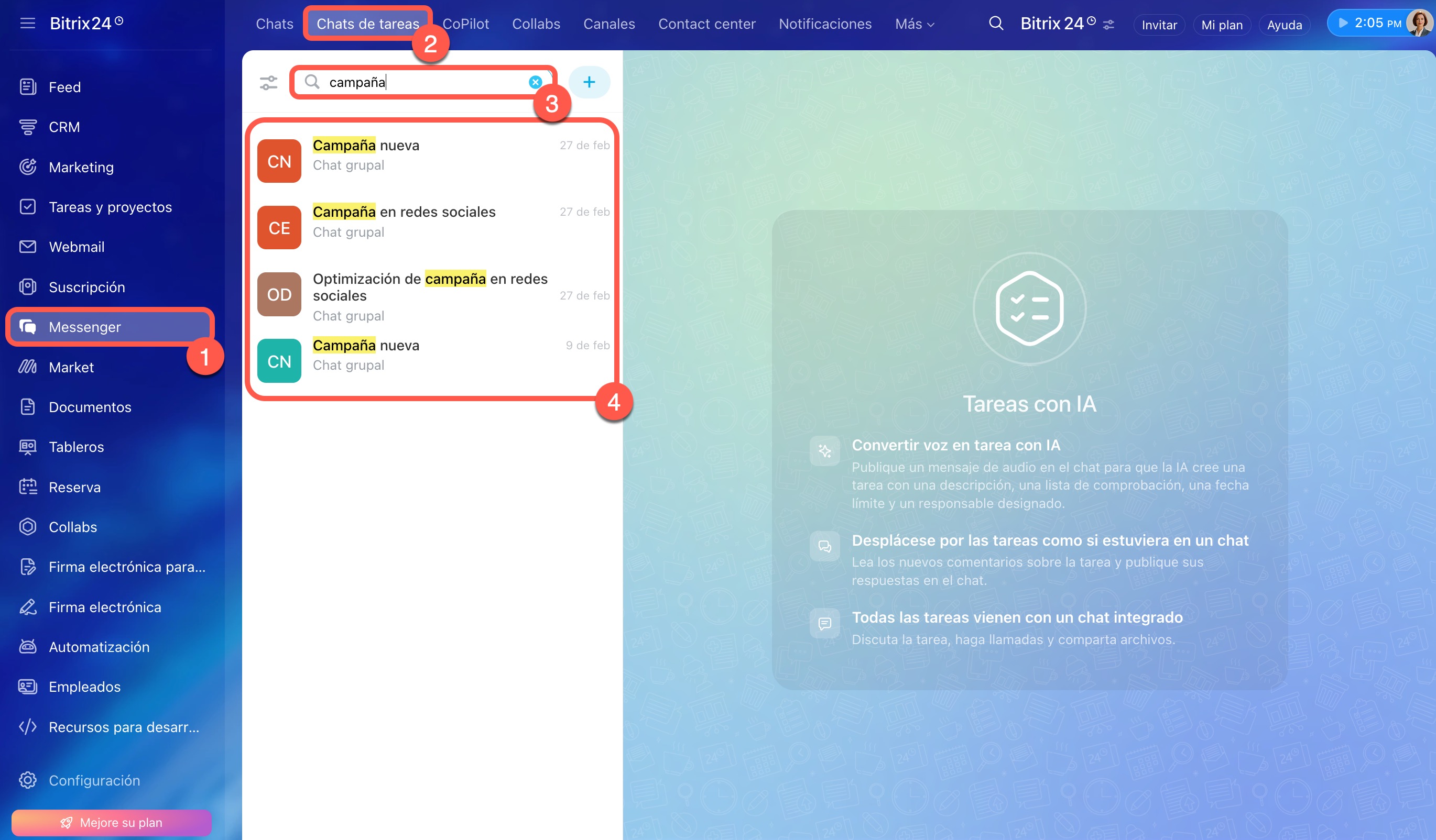 Ve a la sección Messenger > Chats de tareas. Empieza a escribir el nombre de la tarea en la barra de búsqueda sobre la lista de chats —por ejemplo, «campaña». Aparecerá una lista de resultados: selecciona el chat de la tarea que necesites.
