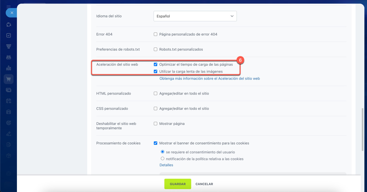 6. En el campo Aceleración del sitio web, activa las opciones que desees utilizar.