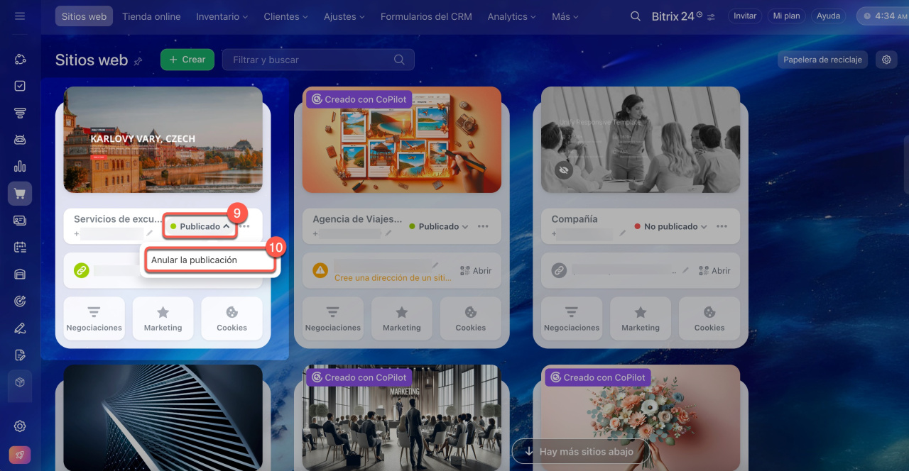 9-10. Para que la configuración se aplique correctamente, debes volver a publicar tu sitio web. Haz clic en la flecha junto al estado, despublica el sitio web y vuelve a publicarlo.