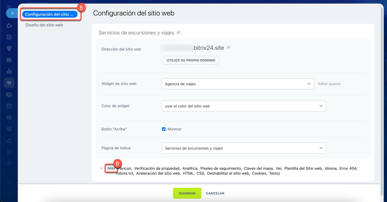 5-6. En la pestaña Configuración del sitio web, despliega la sección Más.
