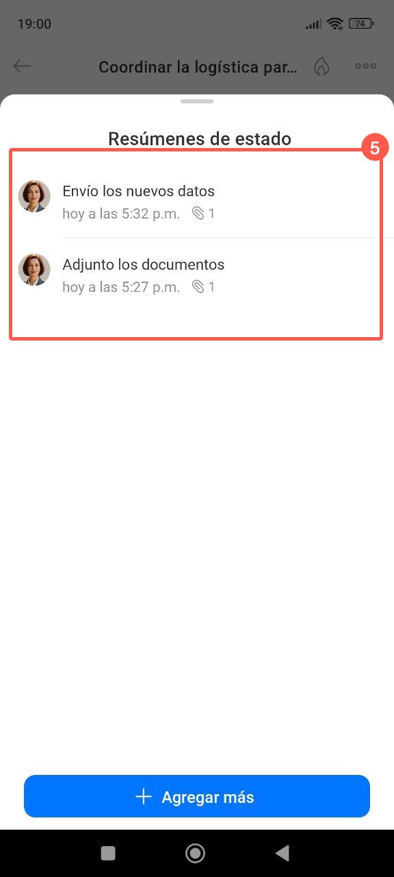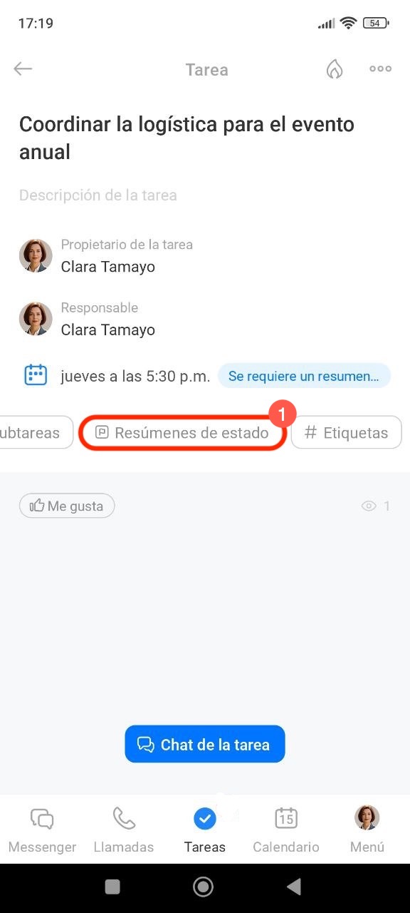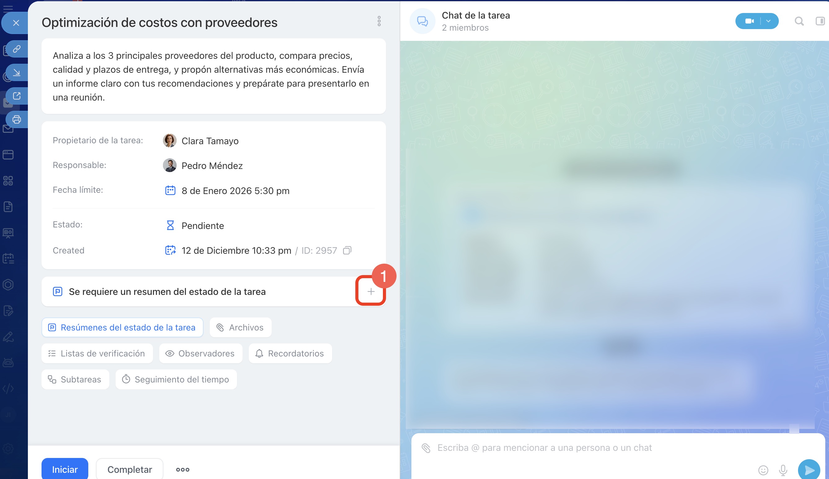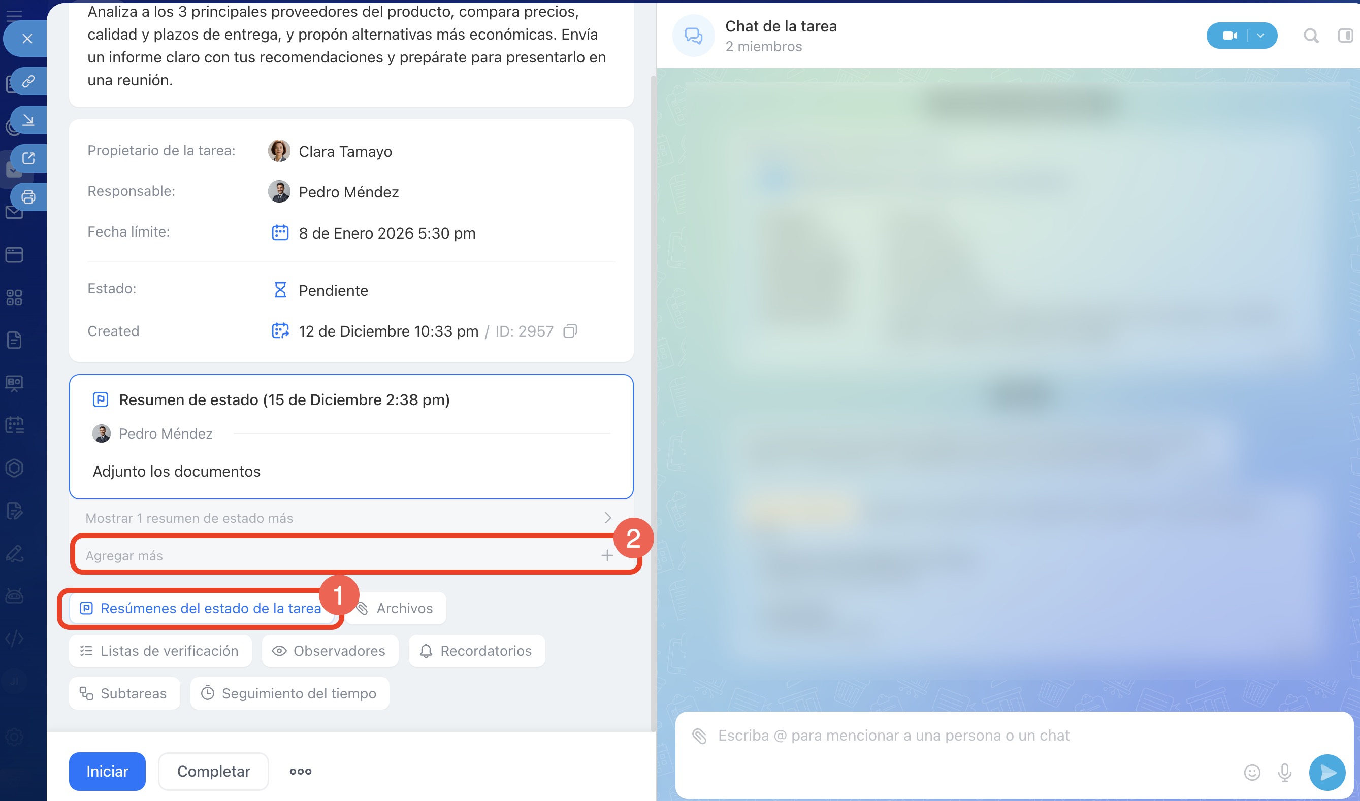 Puedes agregar un resumen a través del botón Resúmenes del estado o del chat de la tarea.