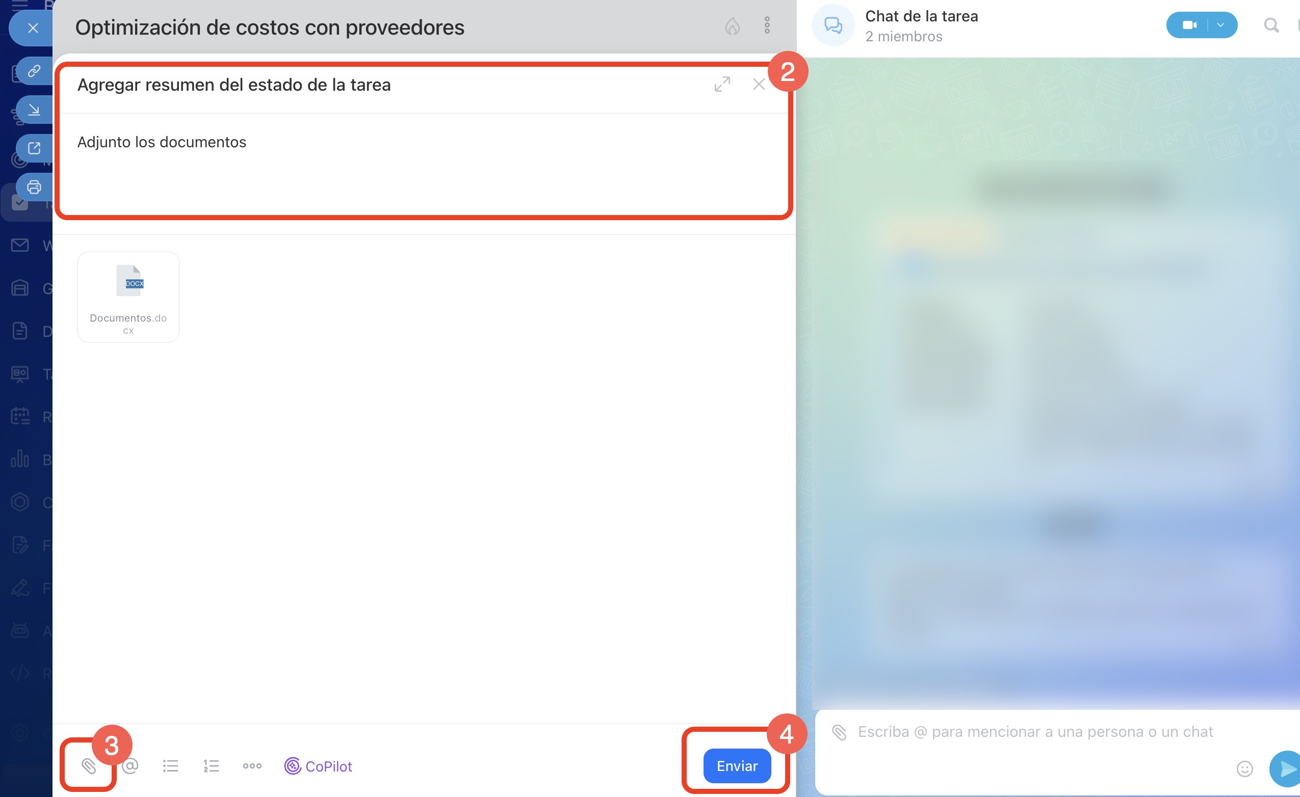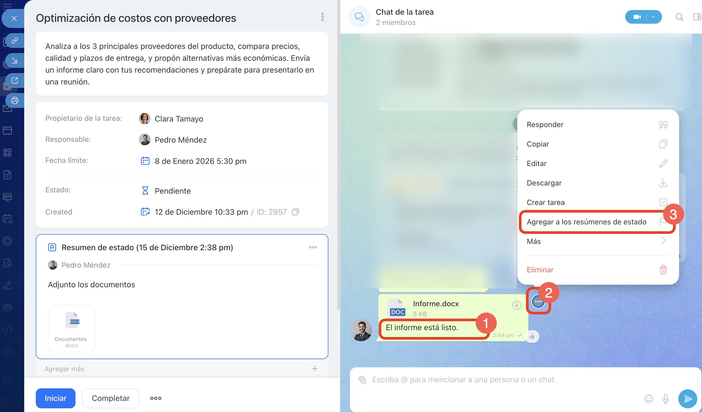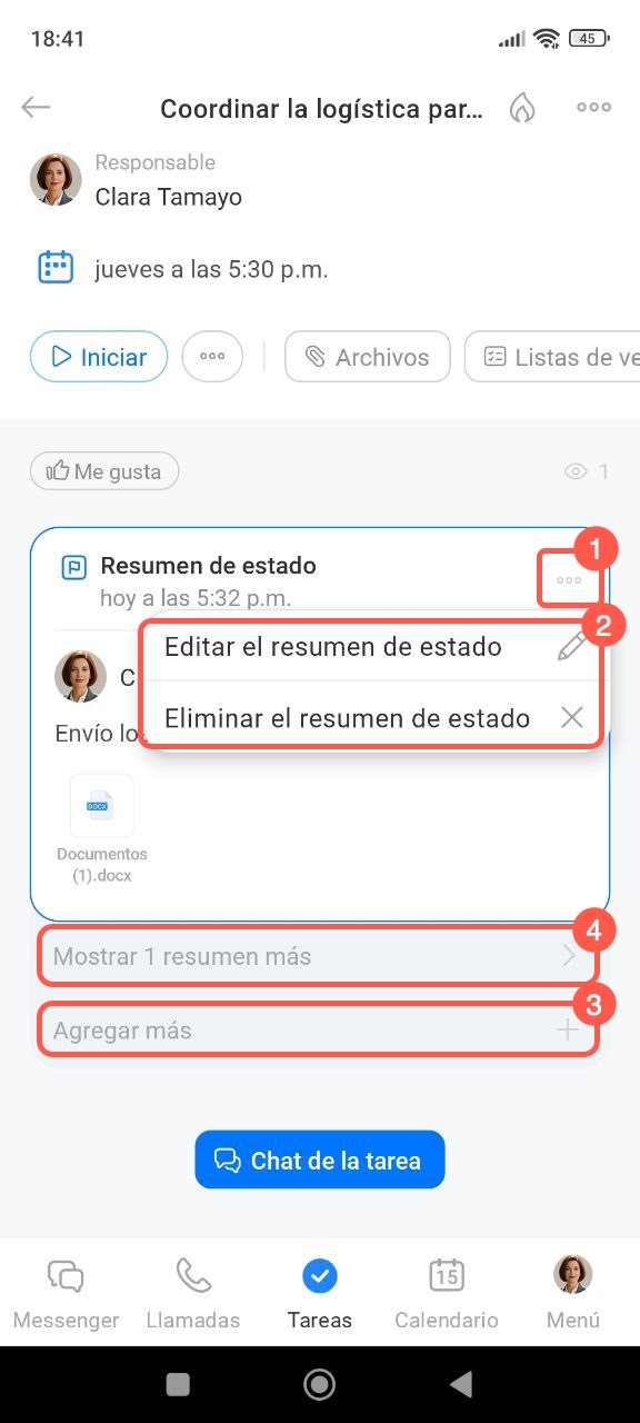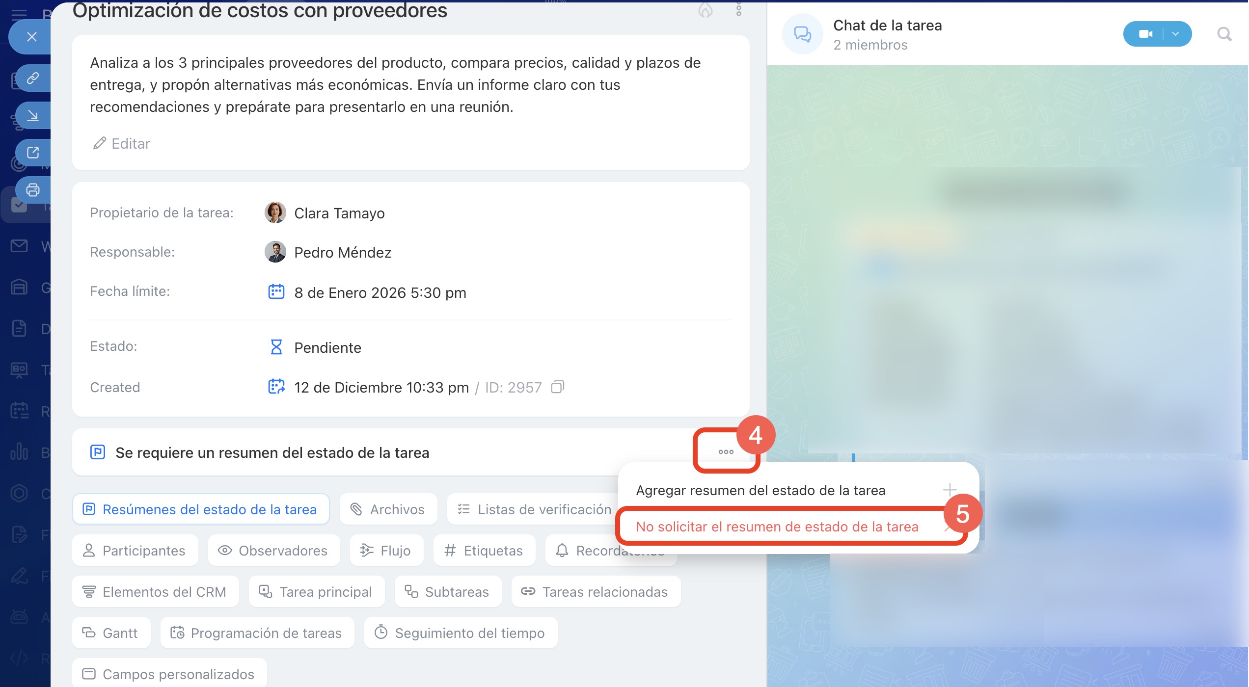 Puedes agregar un resumen a través del botón Resúmenes del estado o del chat de la tarea.