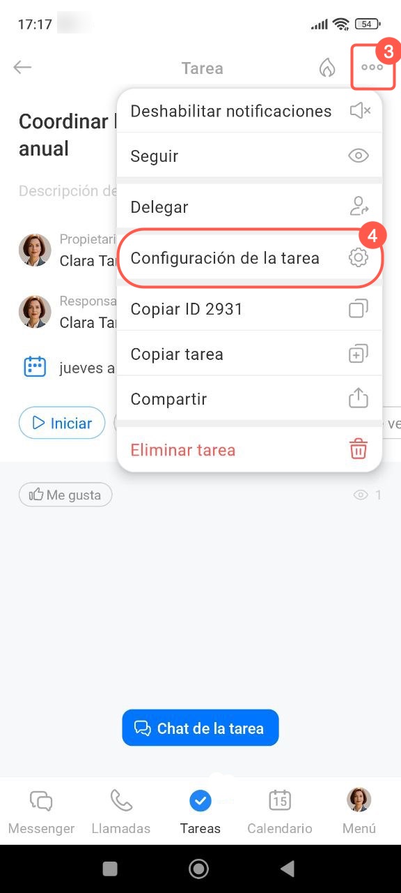 3–4. Toca Tres puntos (...) > Configuración de la tarea (⚙️).
