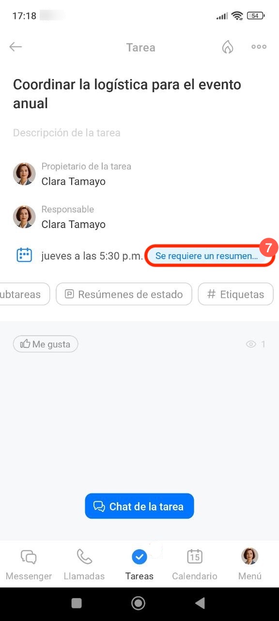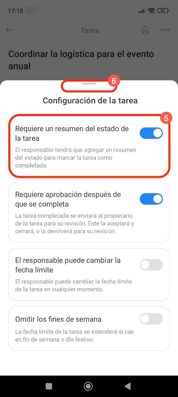 6. Desliza el control hacia abajo para salir de la configuración. En la ficha de la tarea aparecerá la notificación Se requiere un resumen del estado de la tarea.