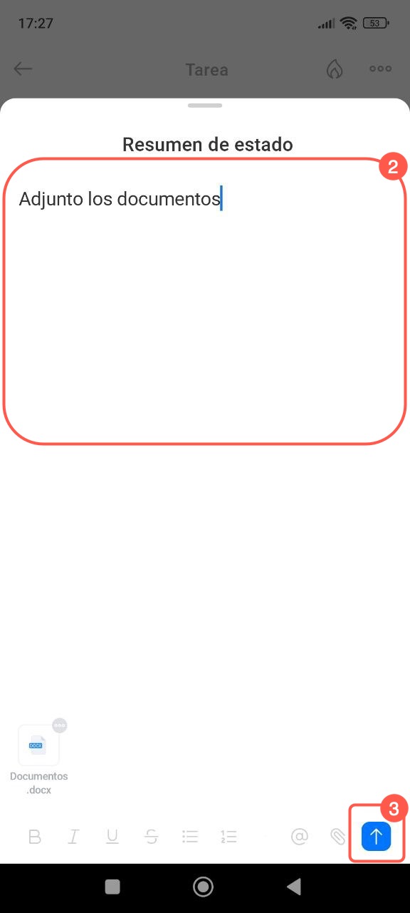 - Para agregar un resultado a través del bloque Se requiere un resumen del estado de la tarea, haz clic en ➕, escribe el texto, adjunta documentos y haz clic en Enviar.