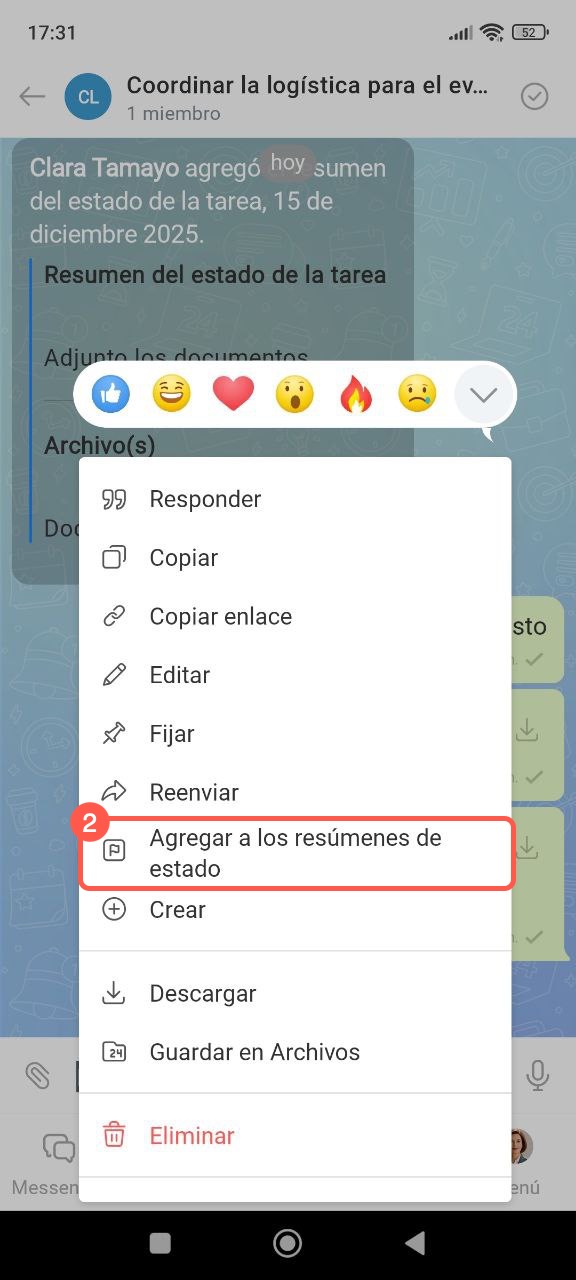 - Para agregar un resultado a través del chat de la tarea, envía un mensaje y haz clic en Tres puntos (...) > Agregar a los resúmenes de estado.