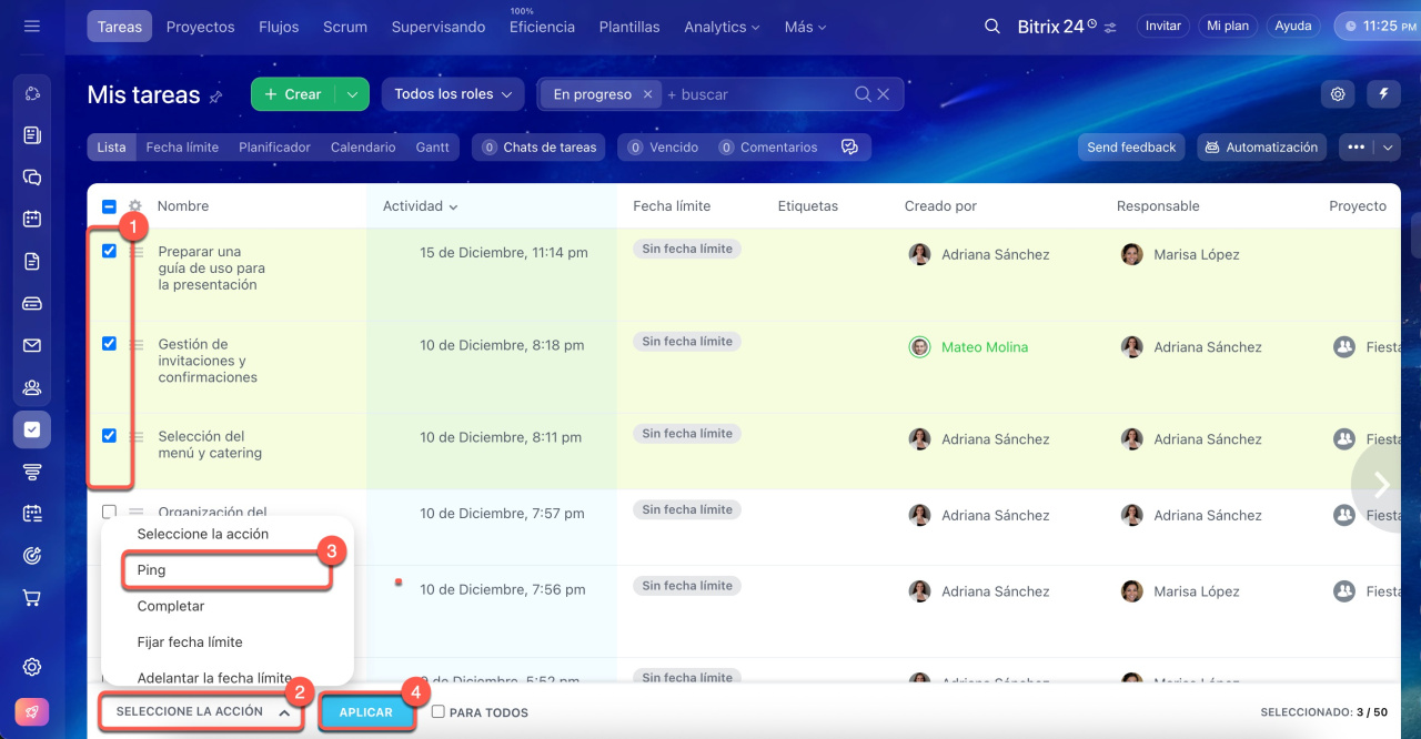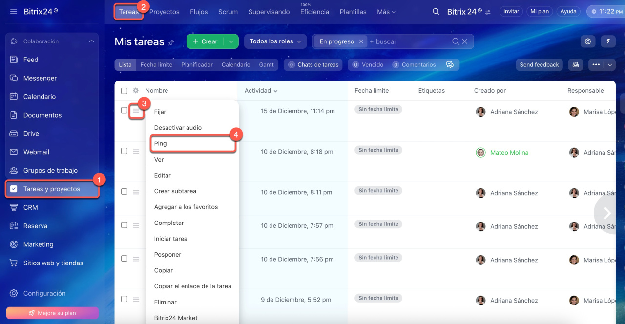 Accede a Tareas y proyectos > Tareas, selecciona la tarea deseada, abre el Menú (≡) y haz clic en Ping. El responsable y los participantes recibirán una notificación que indica que has solicitado el estado de la tarea. En el chat de la tarea aparecerá un mensaje del sistema.