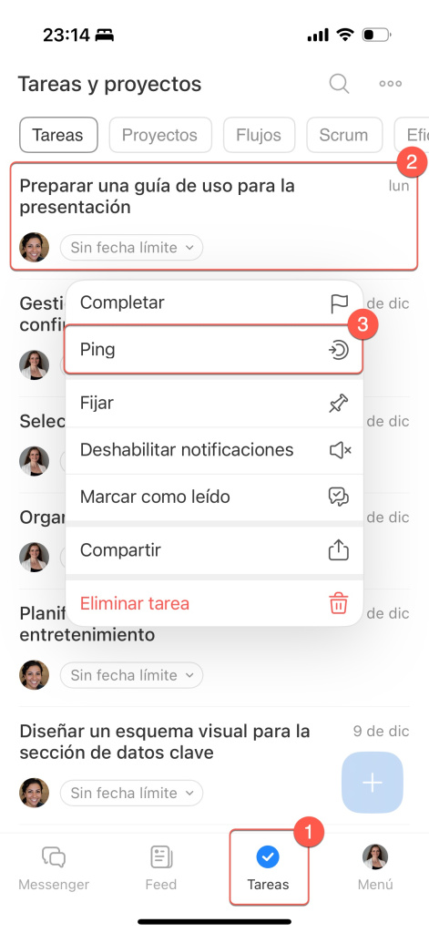 - Se puede enviar un ping desde la lista de tareas: en la versión web a través del menú de la tarea, y en la aplicación móvil manteniendo la tarea presionada.