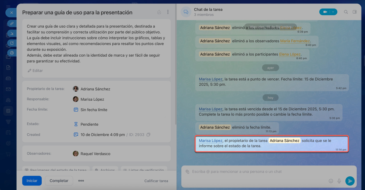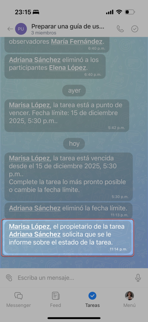 - Creador de la tarea: ve todos los mensajes ping en el chat de la tarea, pero no recibe notificaciones de sus propios pings, solo de las acciones que realicen otros en la tarea.