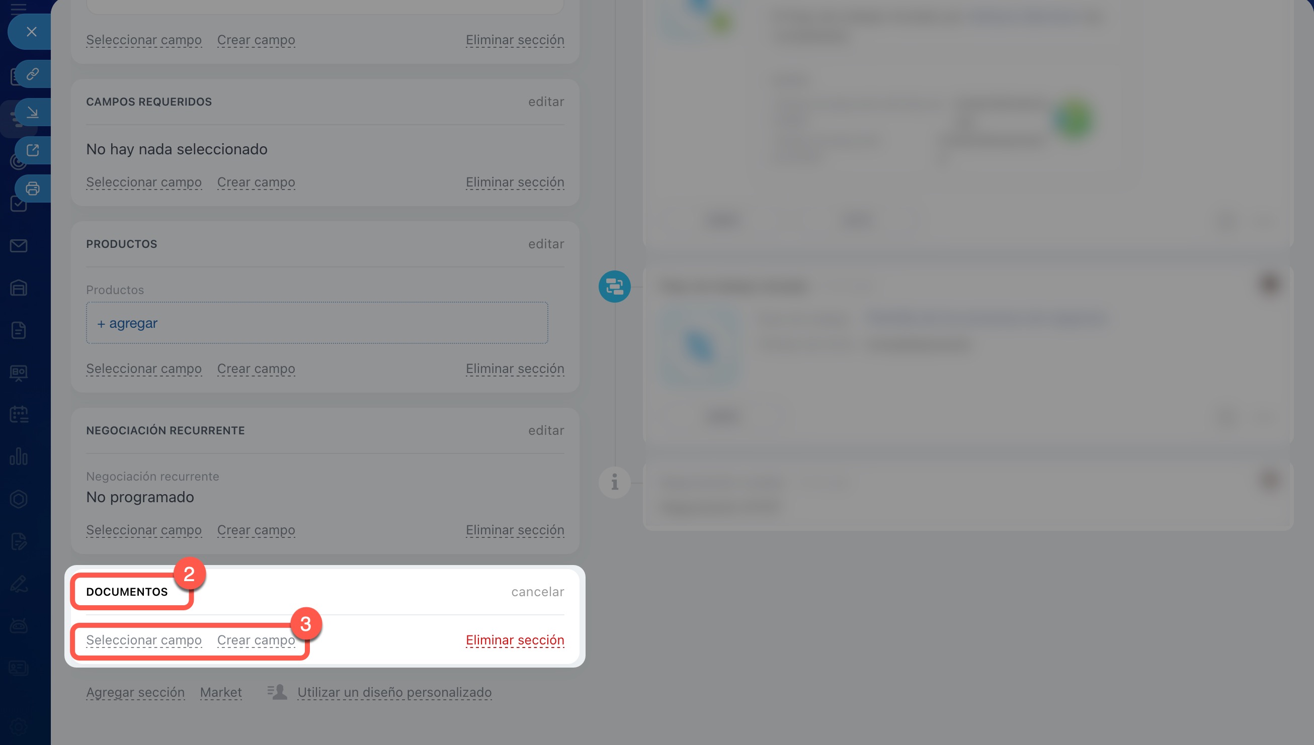 Eliminar una sección. Si ya no necesitas una sección, elimínala. Los campos de esta sección no se eliminan, solo se ocultan. Si es necesario, podrás agregarlos a otra sección de la ficha.