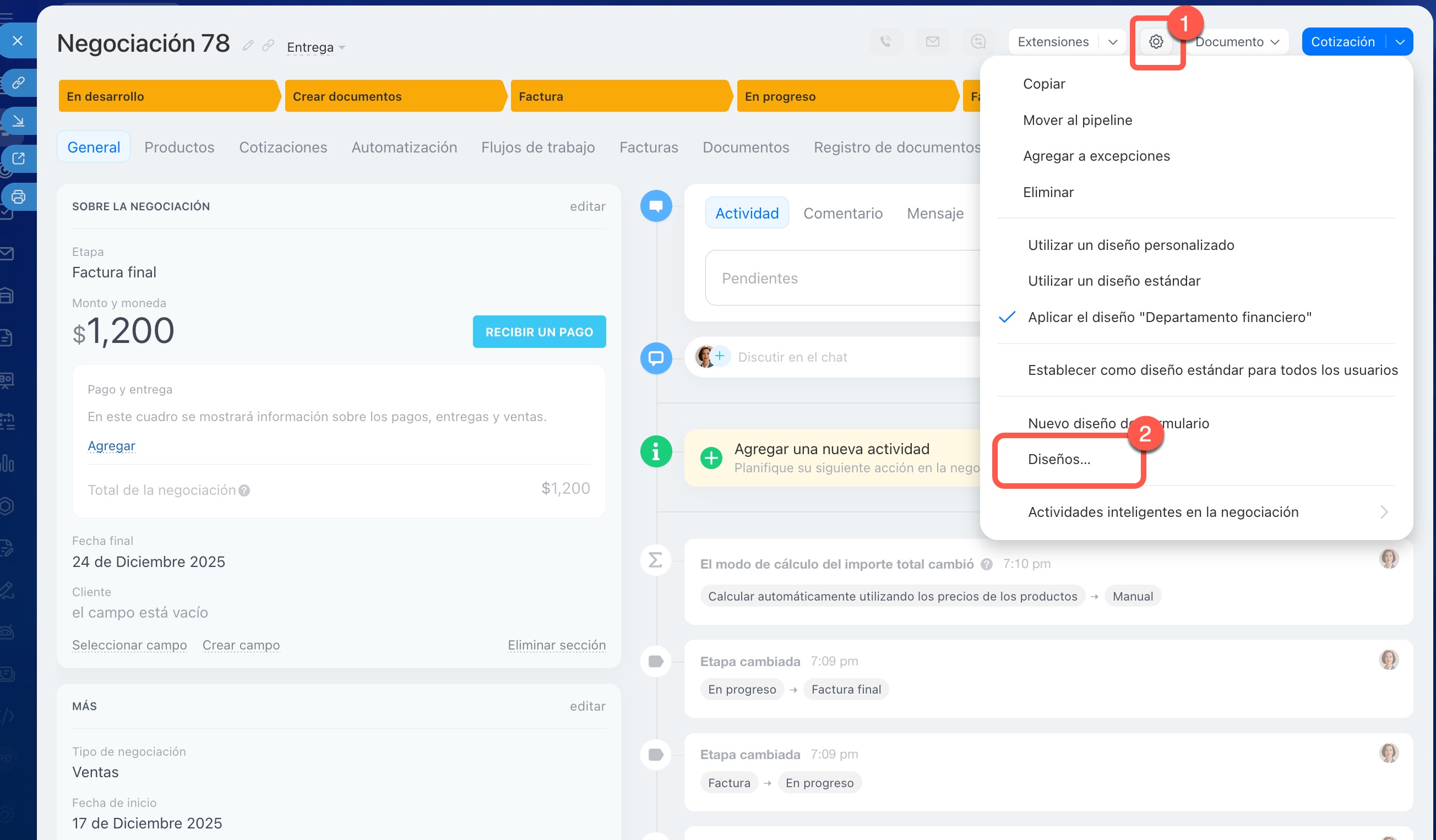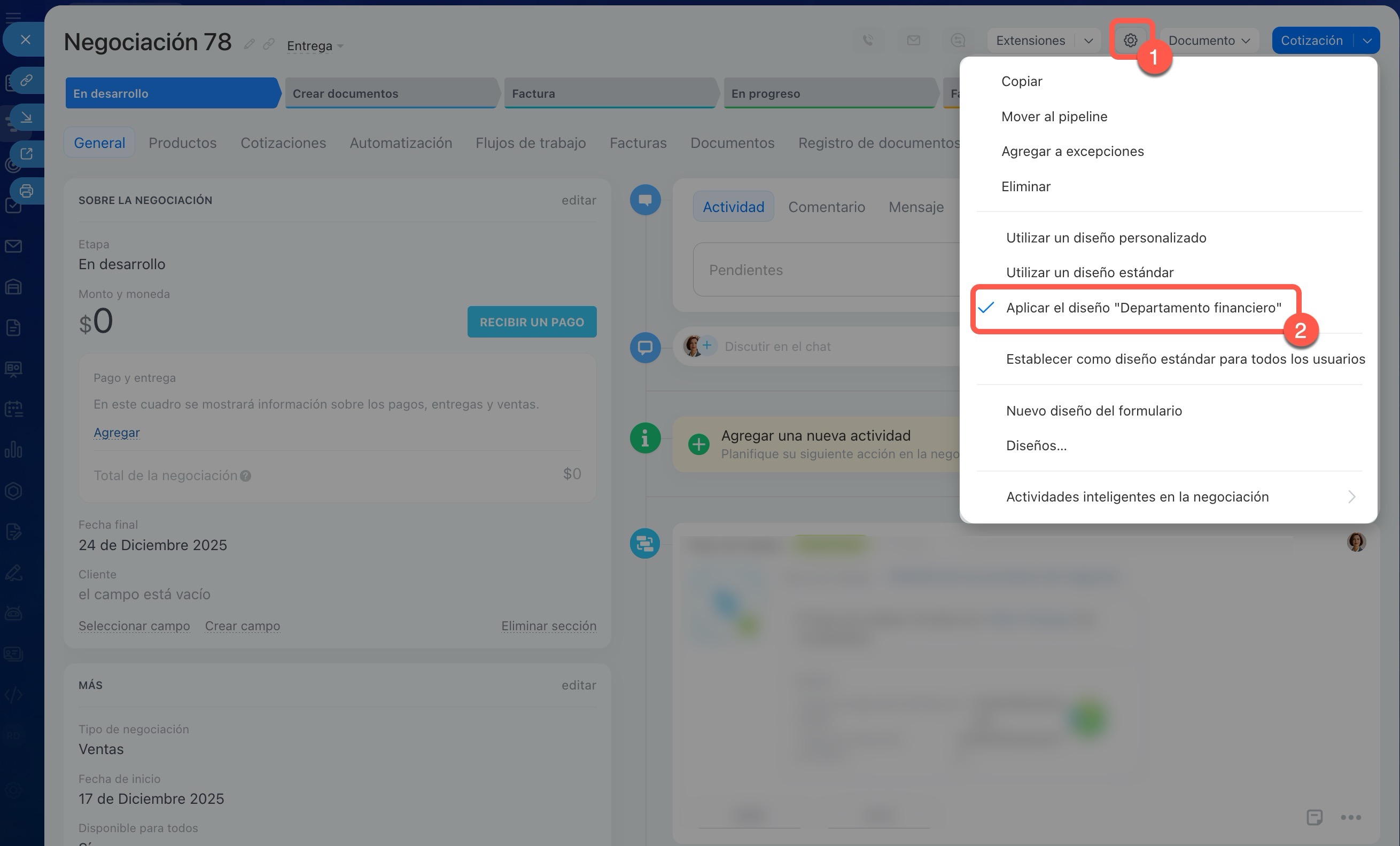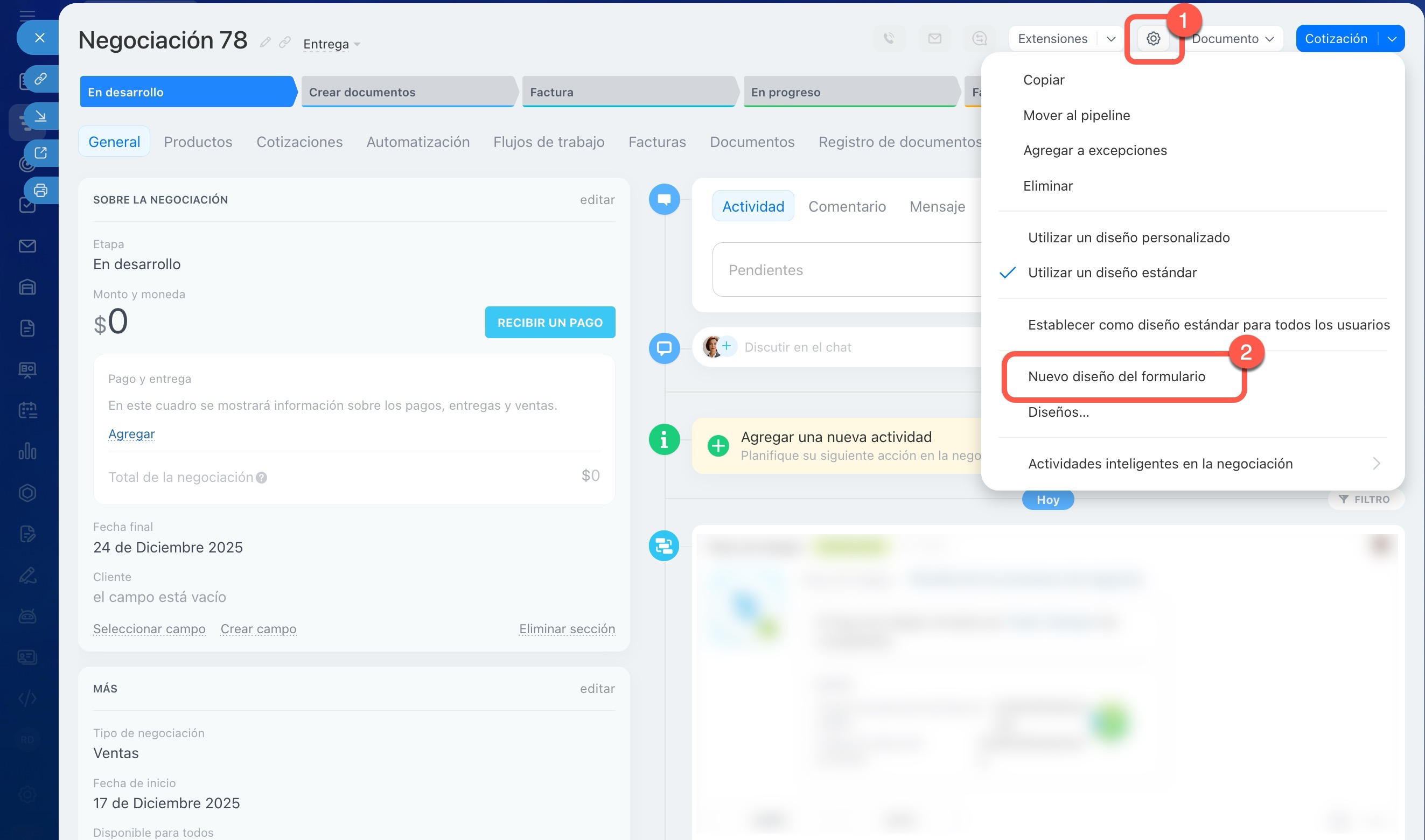 - Un nuevo tipo de ficha se crea en la ficha del CRM: ve a Configuración (⚙️) > Nuevo diseño del formulario.
