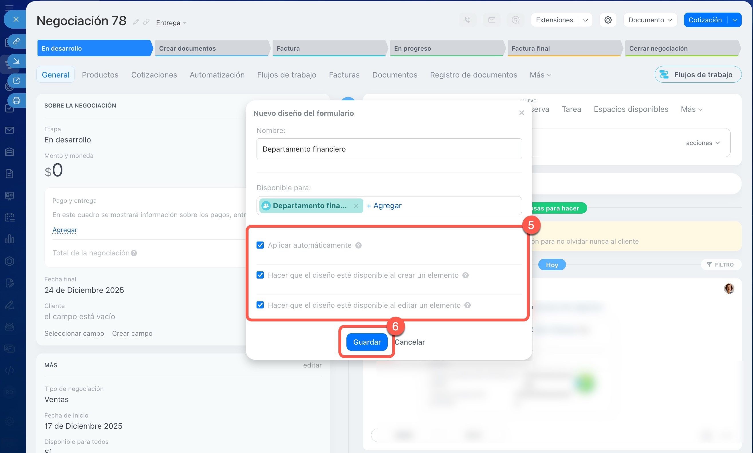 - Hacer que el diseño esté disponible al crear un elemento: los empleados podrán elegir este tipo de ficha al crear un elemento del CRM.
