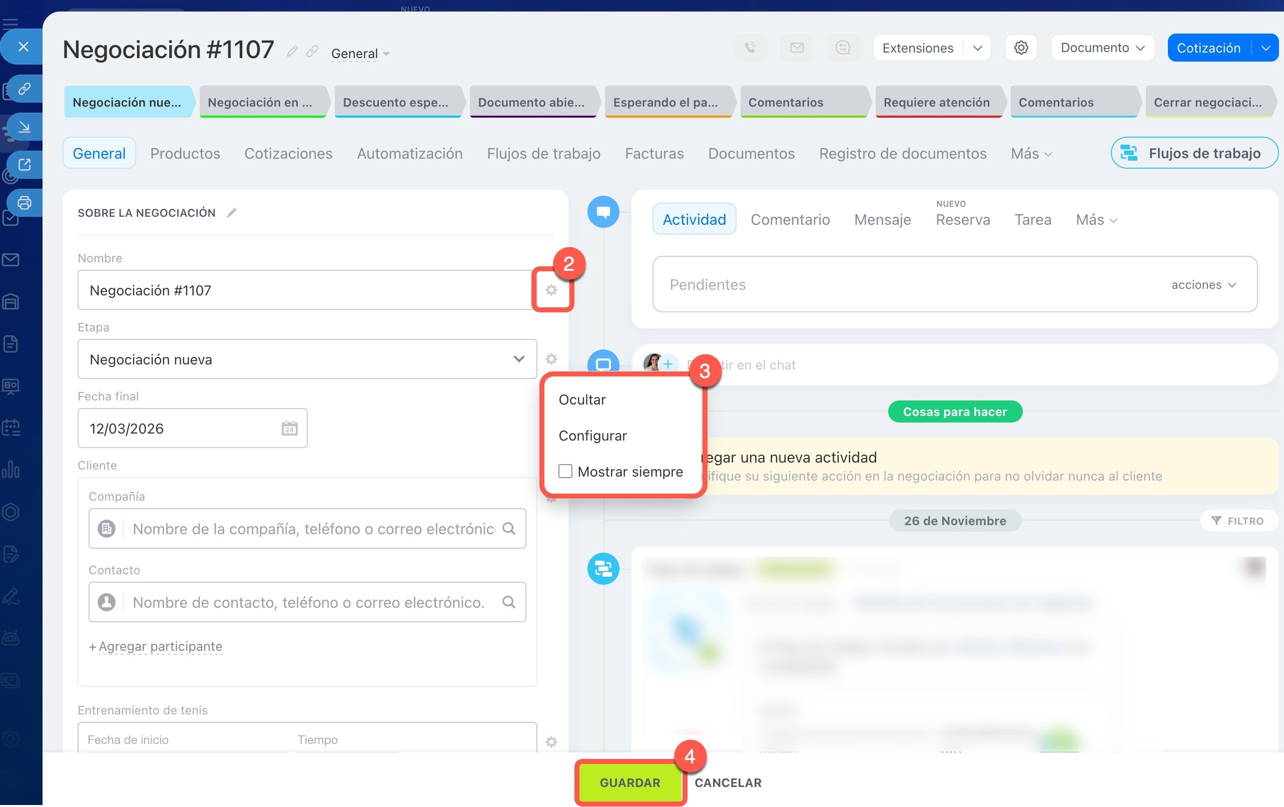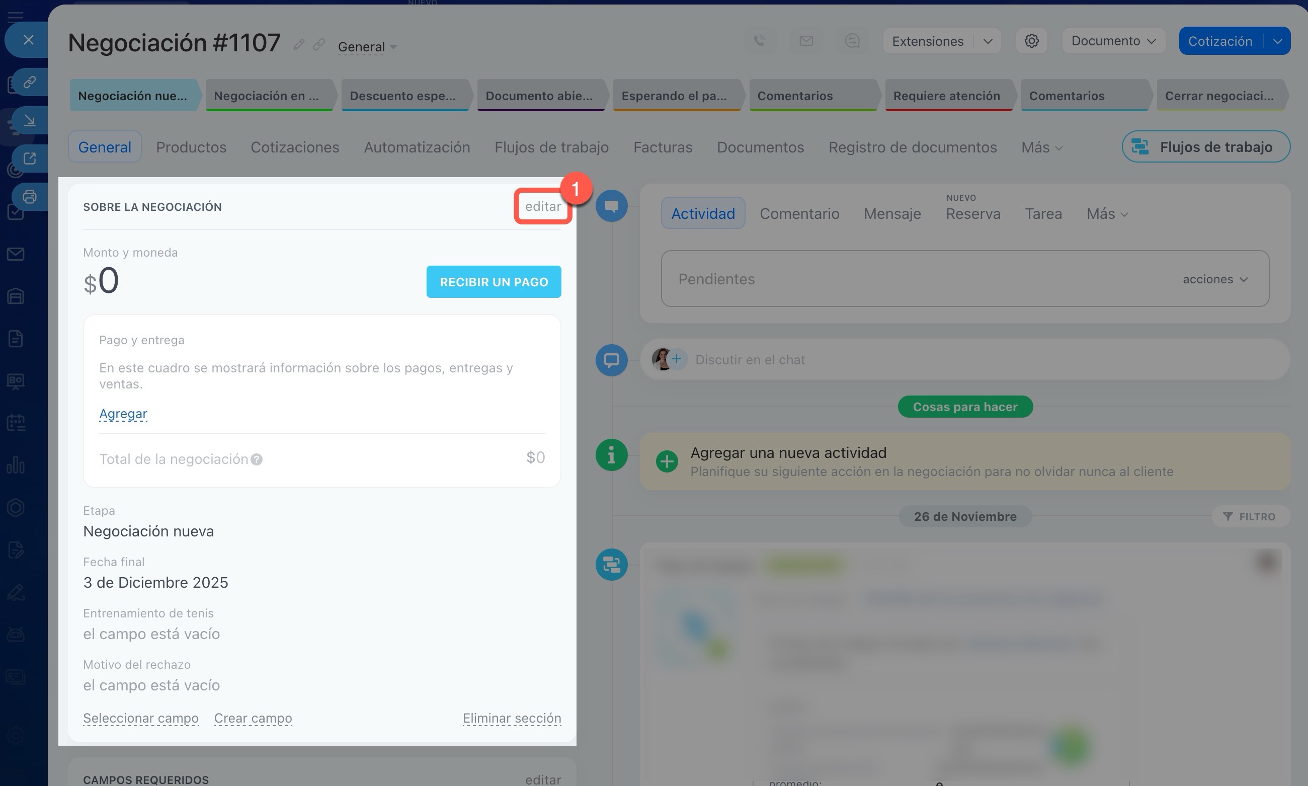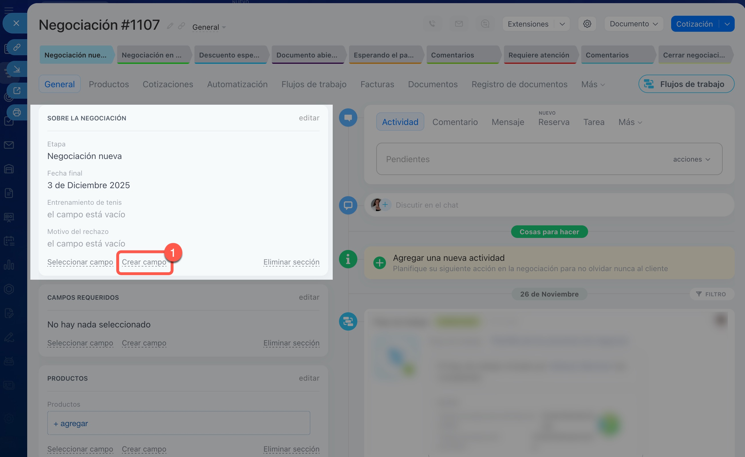 Abre el elemento del CRM que necesites, por ejemplo, un prospecto, una negociación o un contacto.
