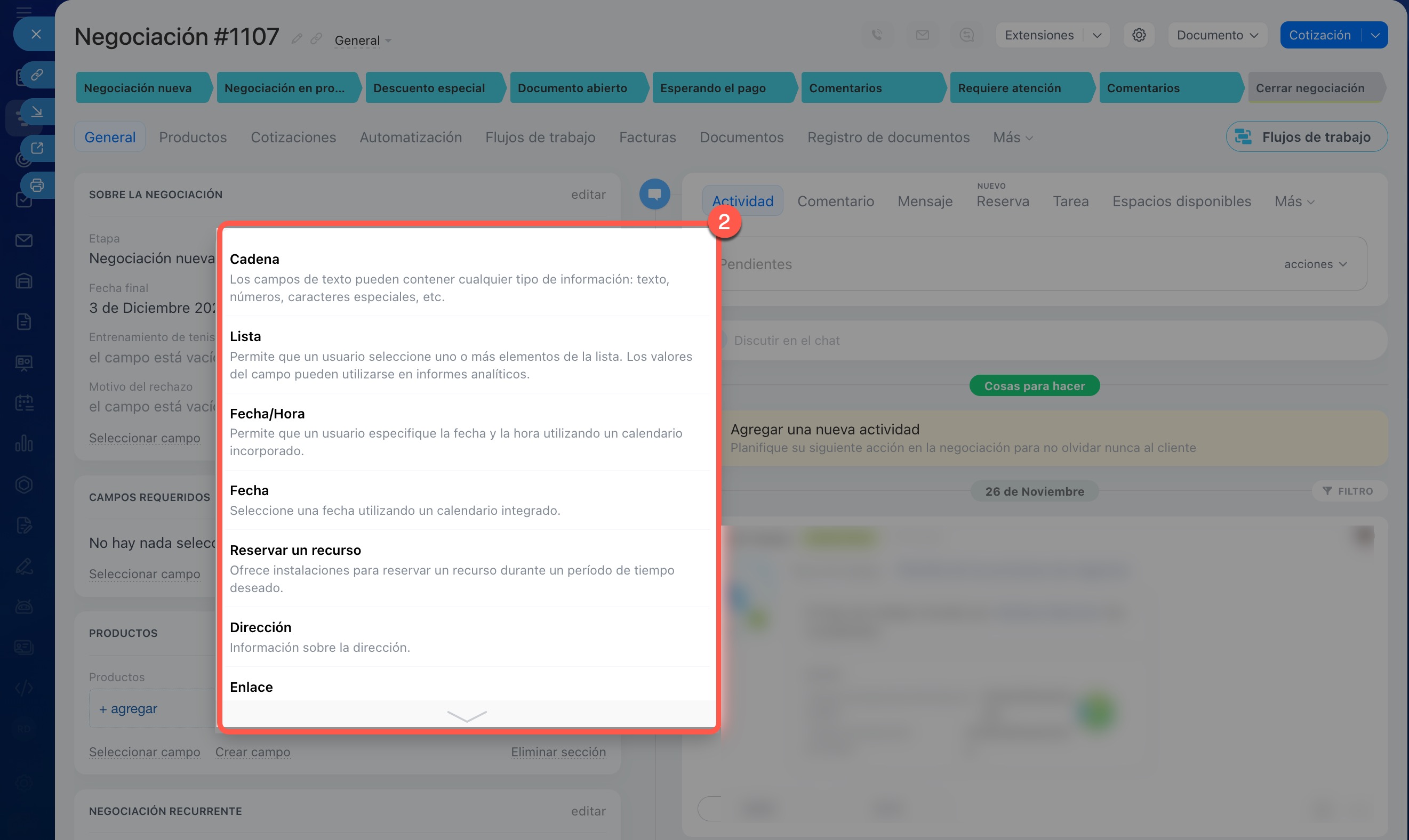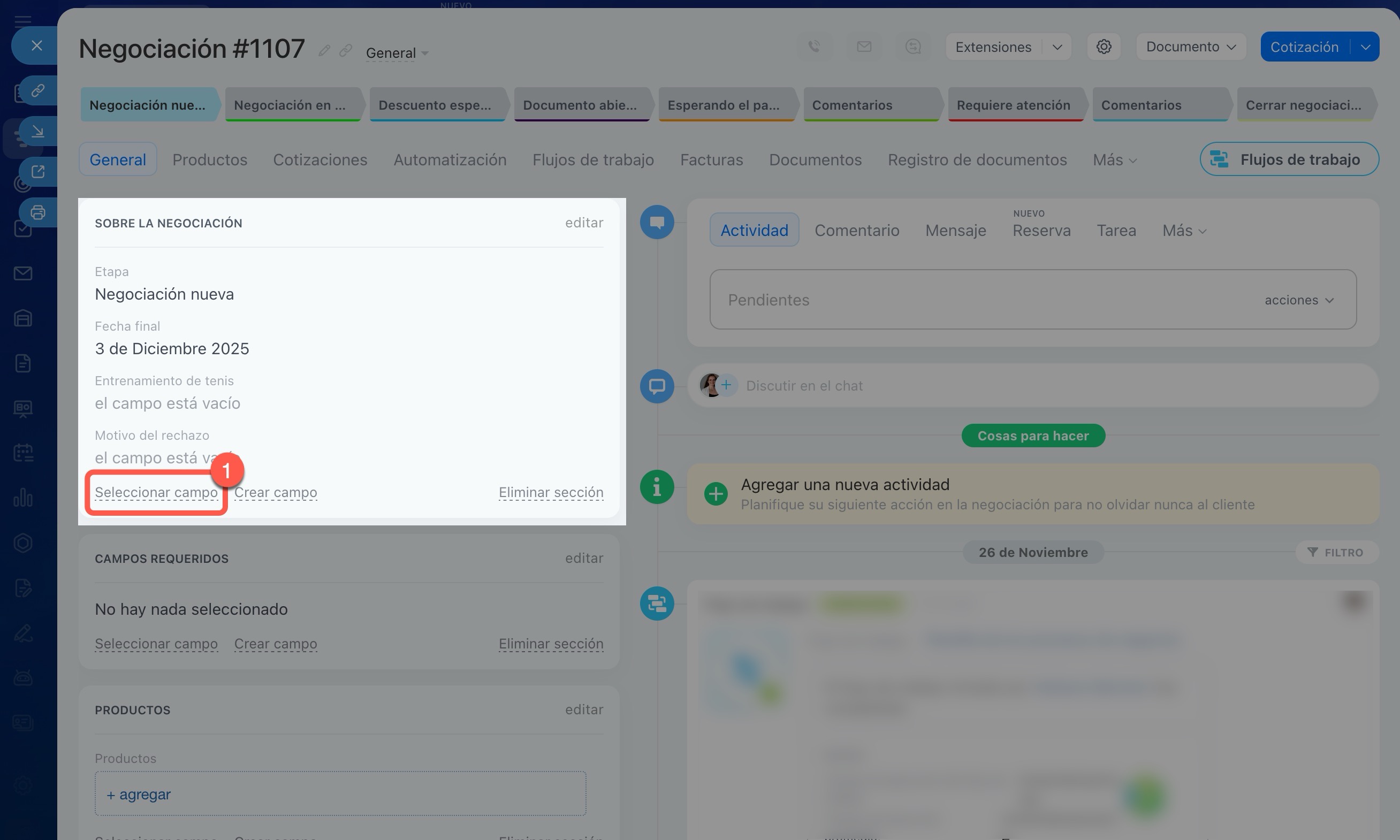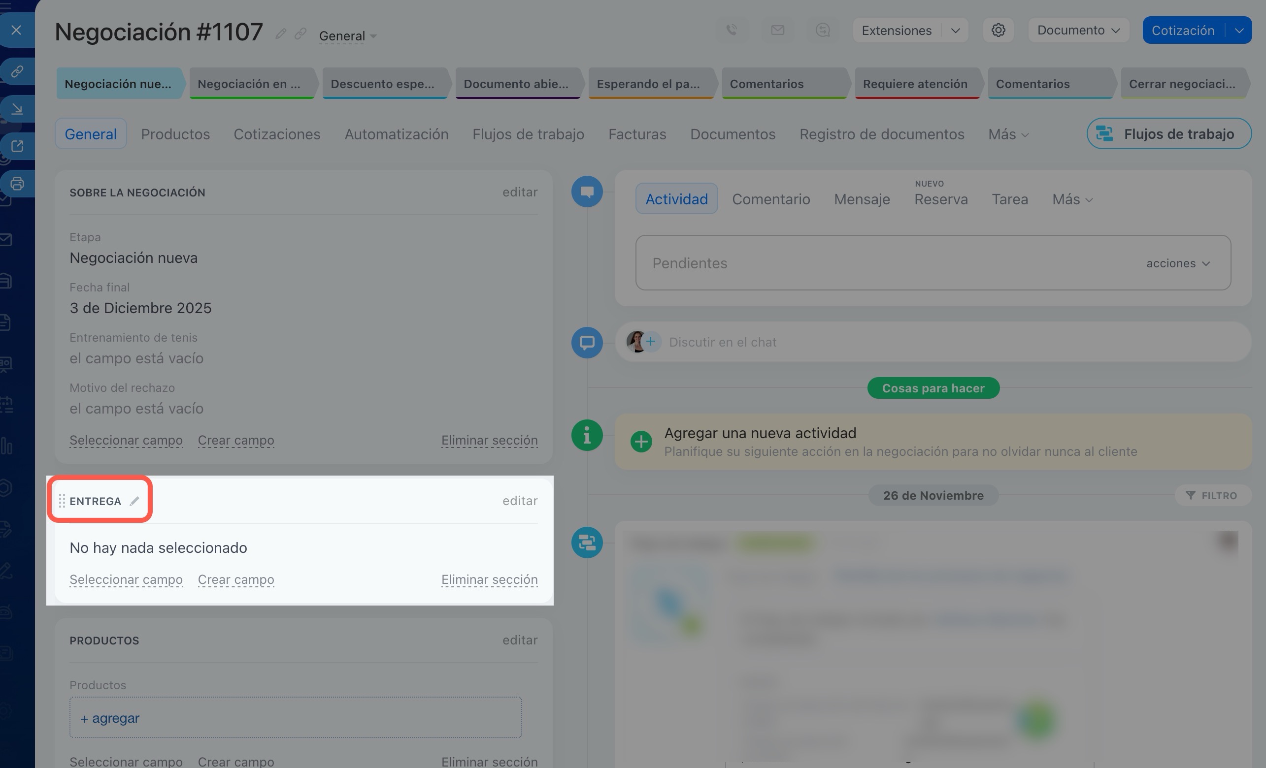 Abre el elemento del CRM que necesites, por ejemplo, un prospecto, una negociación o un contacto.