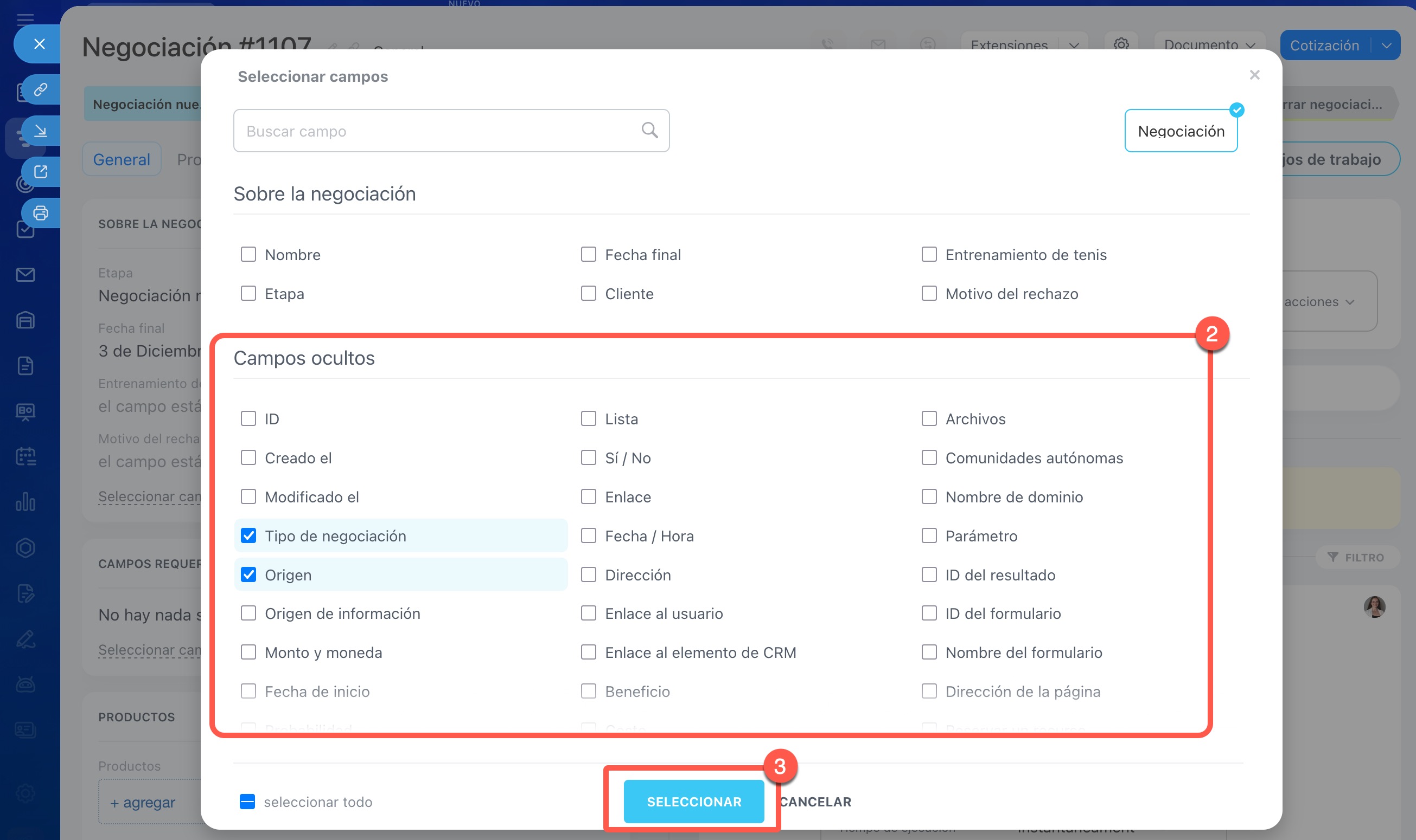 3. Haz clic en Seleccionar: los campos aparecerán en la ficha.
