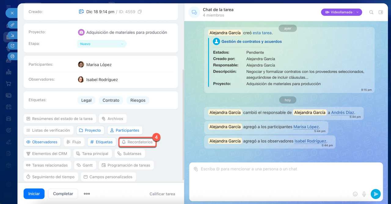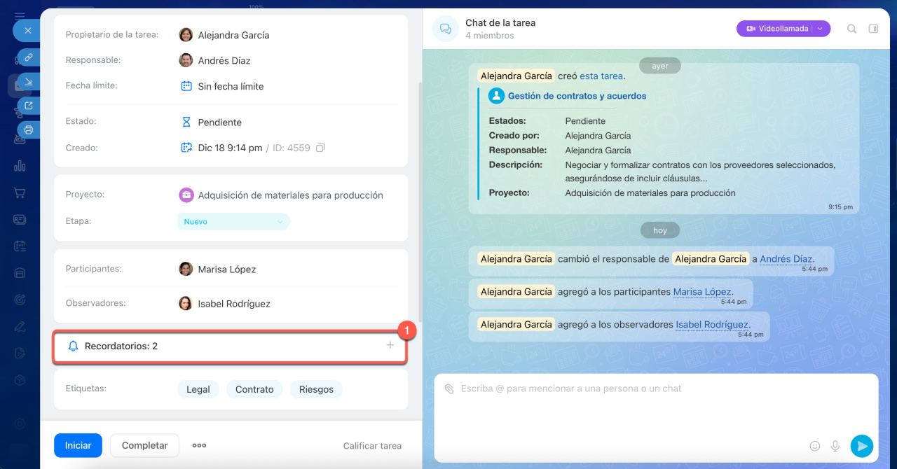 Cualquier persona involucrada en la tarea puede añadir un recordatorio para sí misma o para otros: responsable, creador o participante. Esto se puede hacer al crear o editar una tarea.