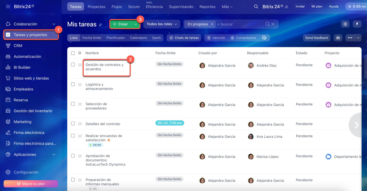 - Los recordatorios en las tareas de Bitrix24 te ayudan a no olvidar etapas importantes del trabajo. Te indican cuándo comenzar, solicitar información, revisar avances intermedios o cerrar una tarea.