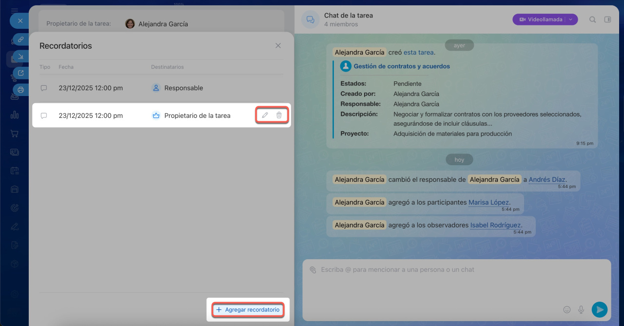 - Los recordatorios configurados se almacenan en la ficha de la tarea. Puedes verlos, editarlos, eliminarlos o añadir nuevos desde el bloque Recordatorios.