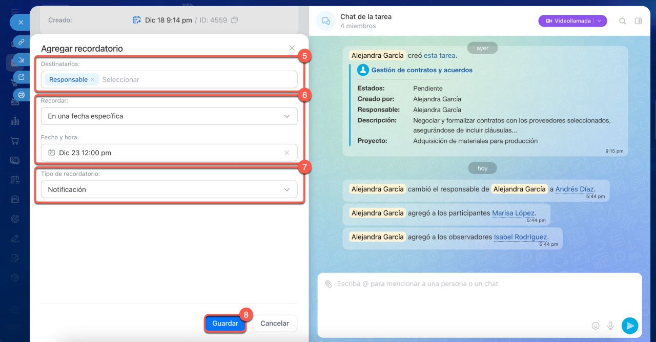 5. Selecciona a quién deseas enviar el recordatorio: responsable, propietario, participantes o a ti mismo.