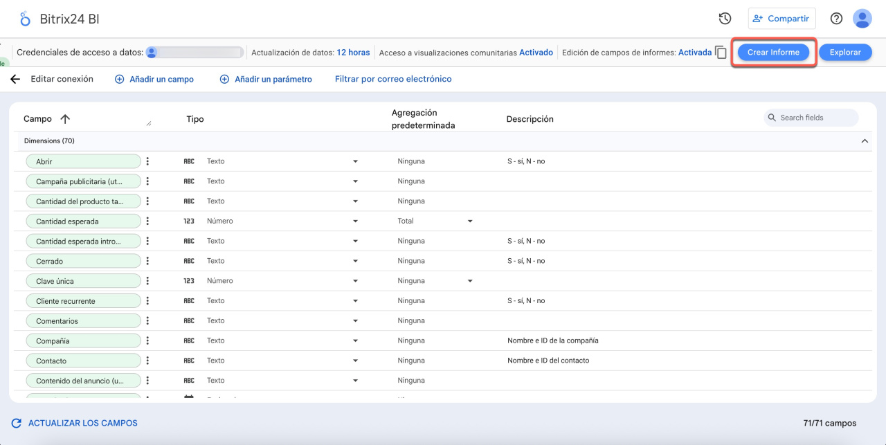 Una vez establecida la conexión, se te pedirá que crees un nuevo informe utilizando el Conector BI de Bitrix24 como fuente de datos. Haz clic en Crear informe para comenzar.