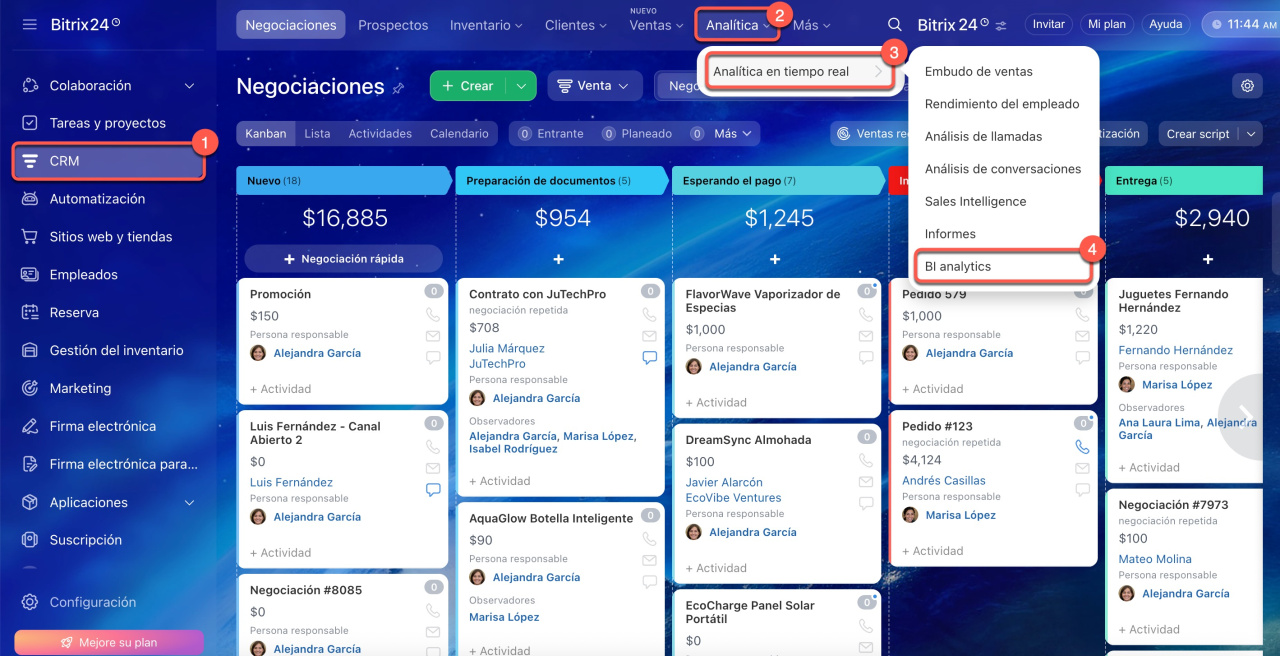 1-4. En tu Bitrix24, accede a CRM > Analítica > Analítica en tiempo real > BI Analytics.
