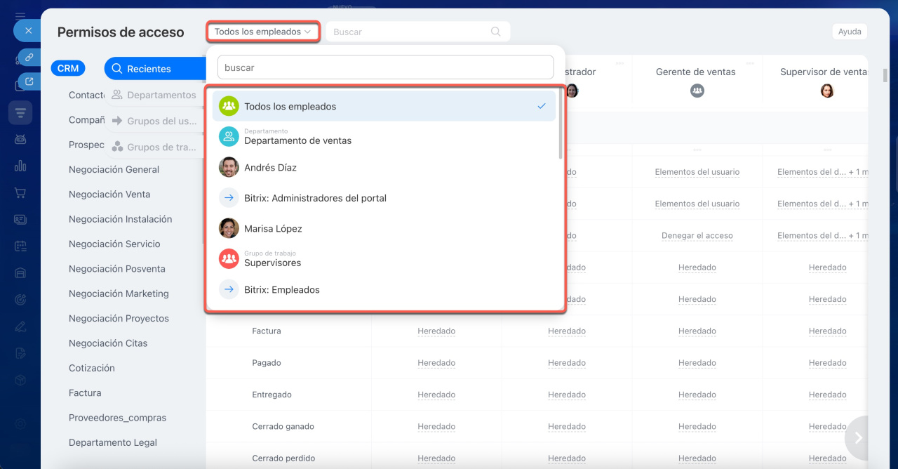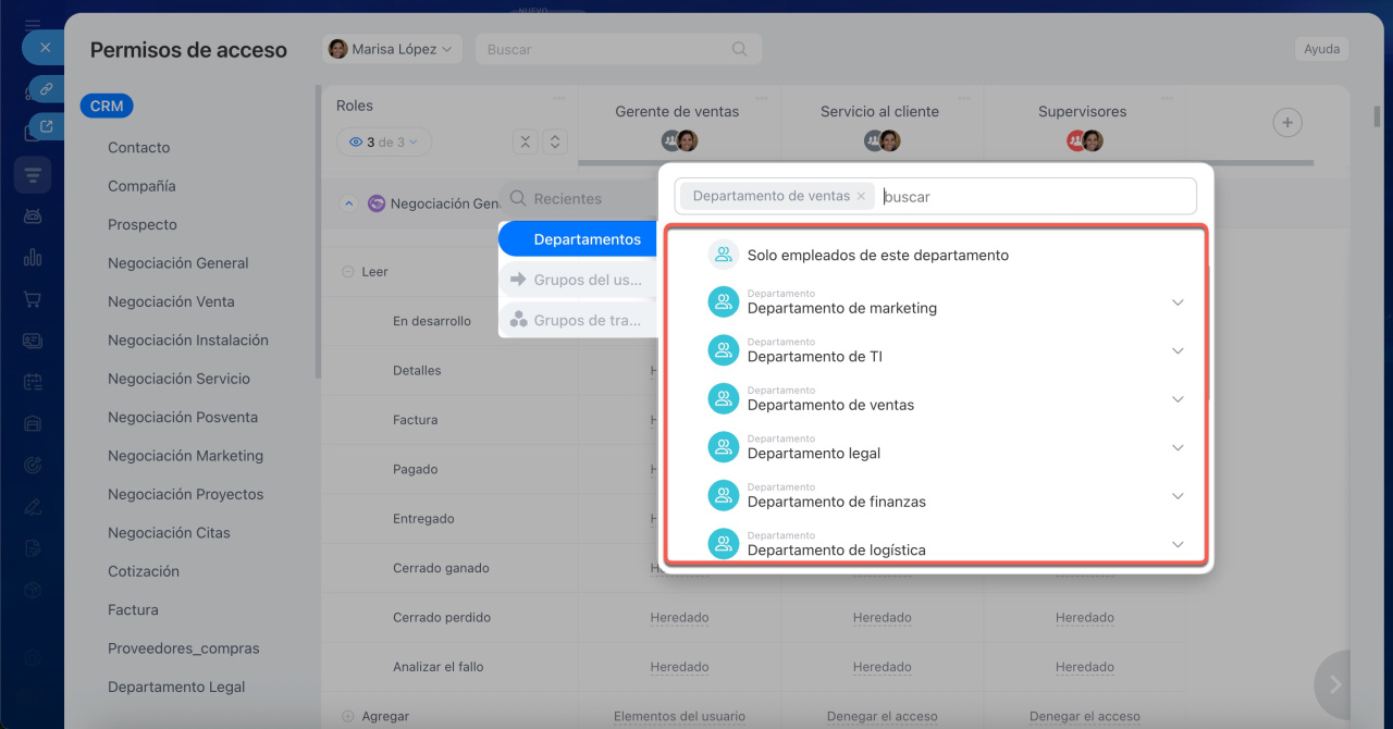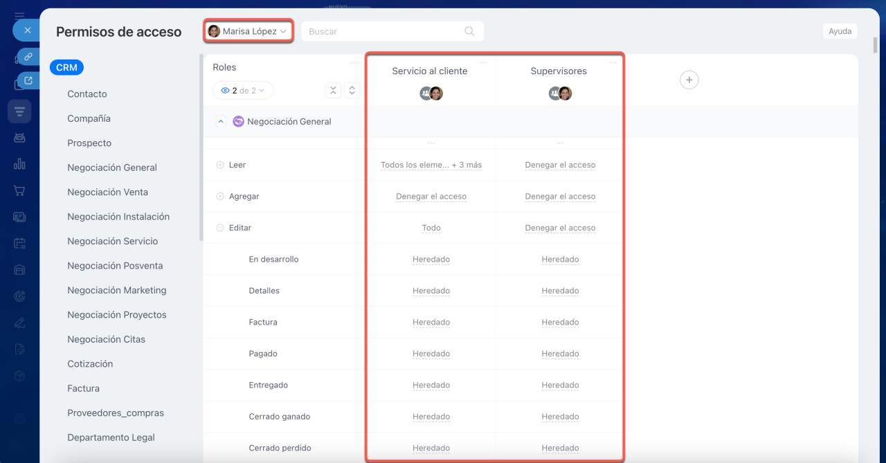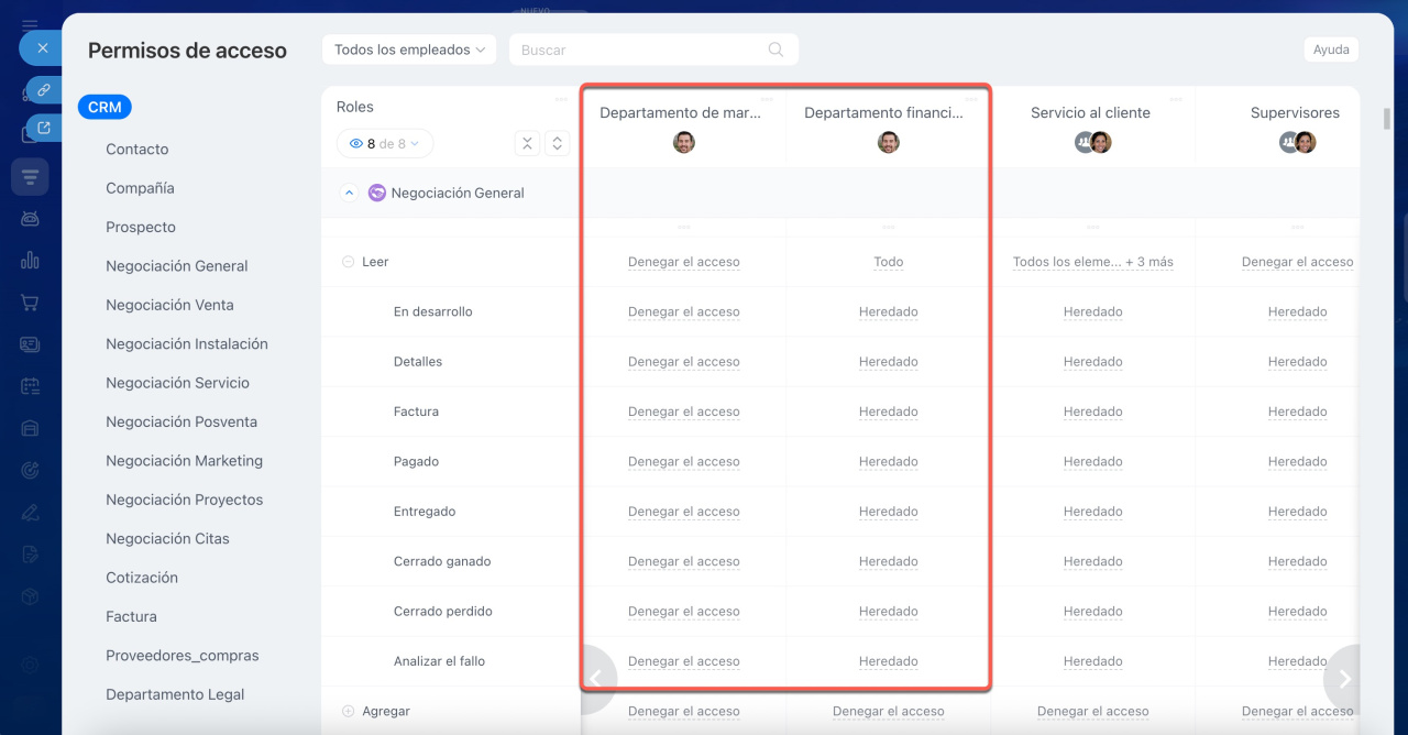 Veamos un ejemplo. Un empleado pertenece a dos departamentos con roles diferentes. Uno deniega el acceso a negociaciones y el otro lo permite. Los permisos del primer departamento son detallados y los del segundo, heredados. Por lo tanto, el empleado no tendrá acceso, porque los permisos detallados prevalecen.
