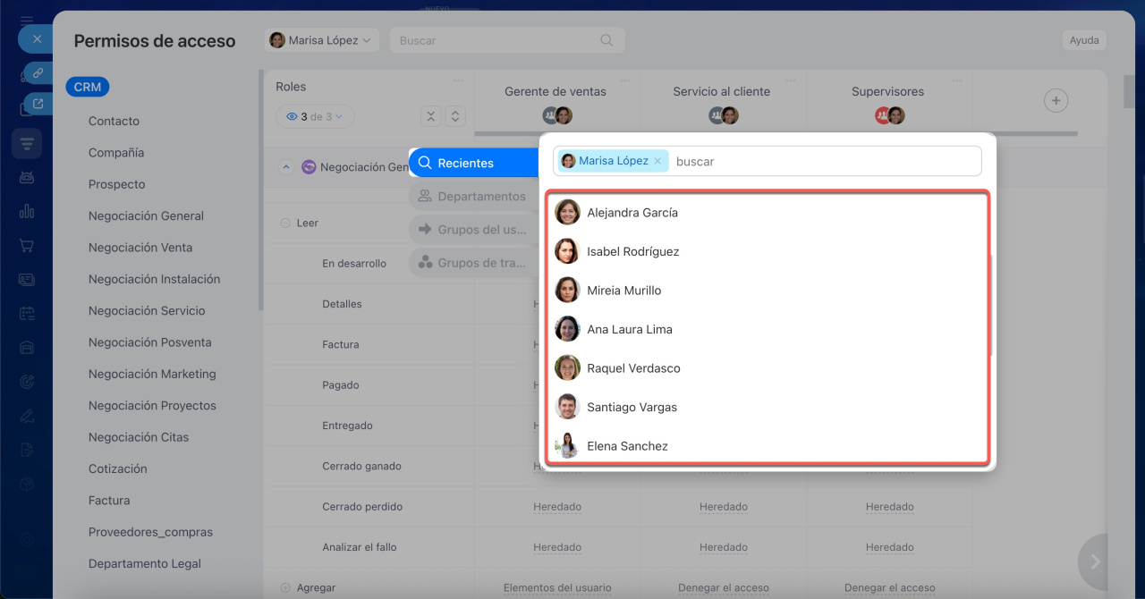 Para detectar permisos superpuestos, selecciona a un empleado en el campo junto a la barra de búsqueda. Verás sus roles asignados. De esta forma, podrás revisar las funciones que tiene disponibles y ajustar la configuración si es necesario.