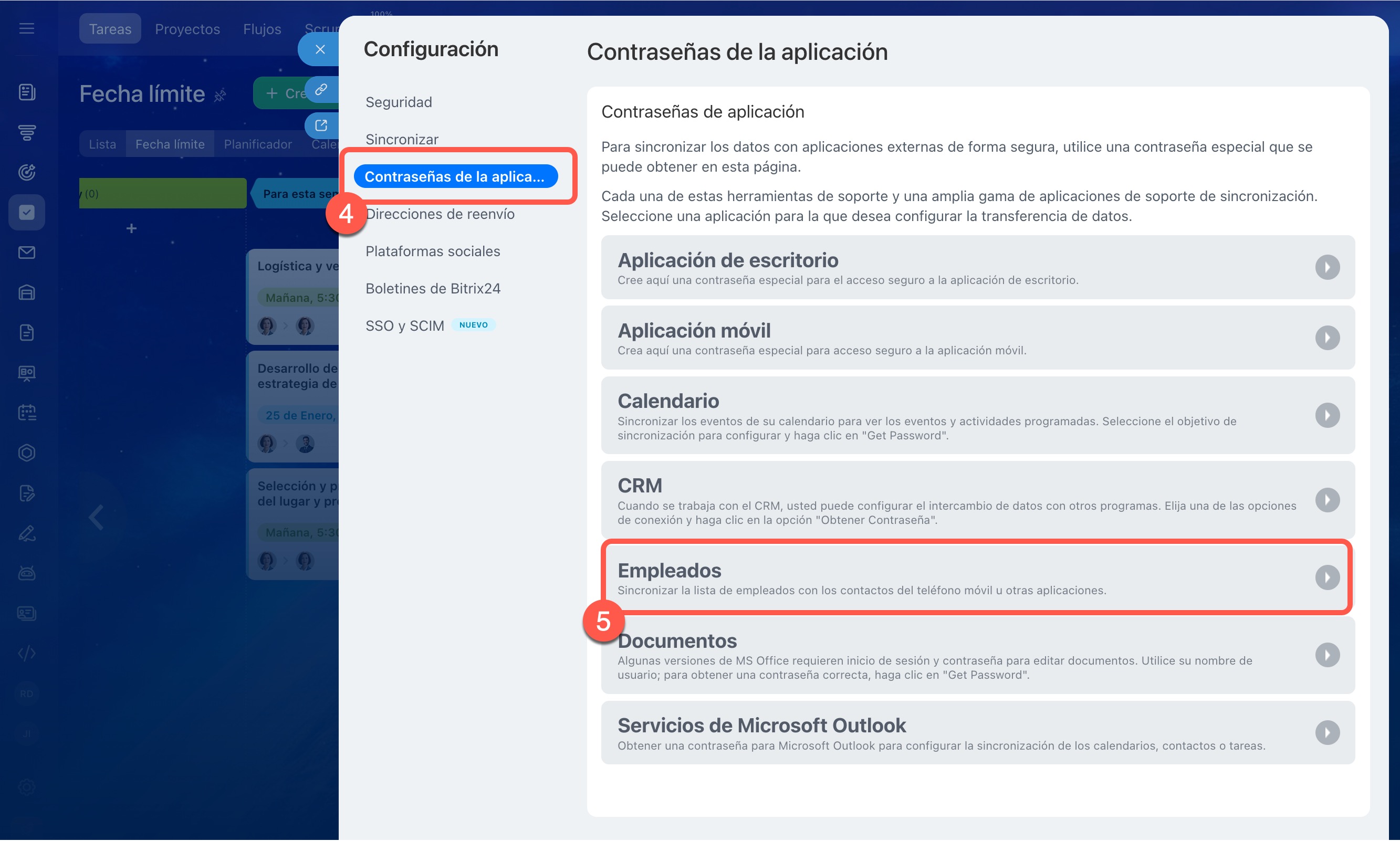 4–5. Haz clic en Contraseñas de aplicaciones y elige qué deseas sincronizar. Por ejemplo, Empleados.