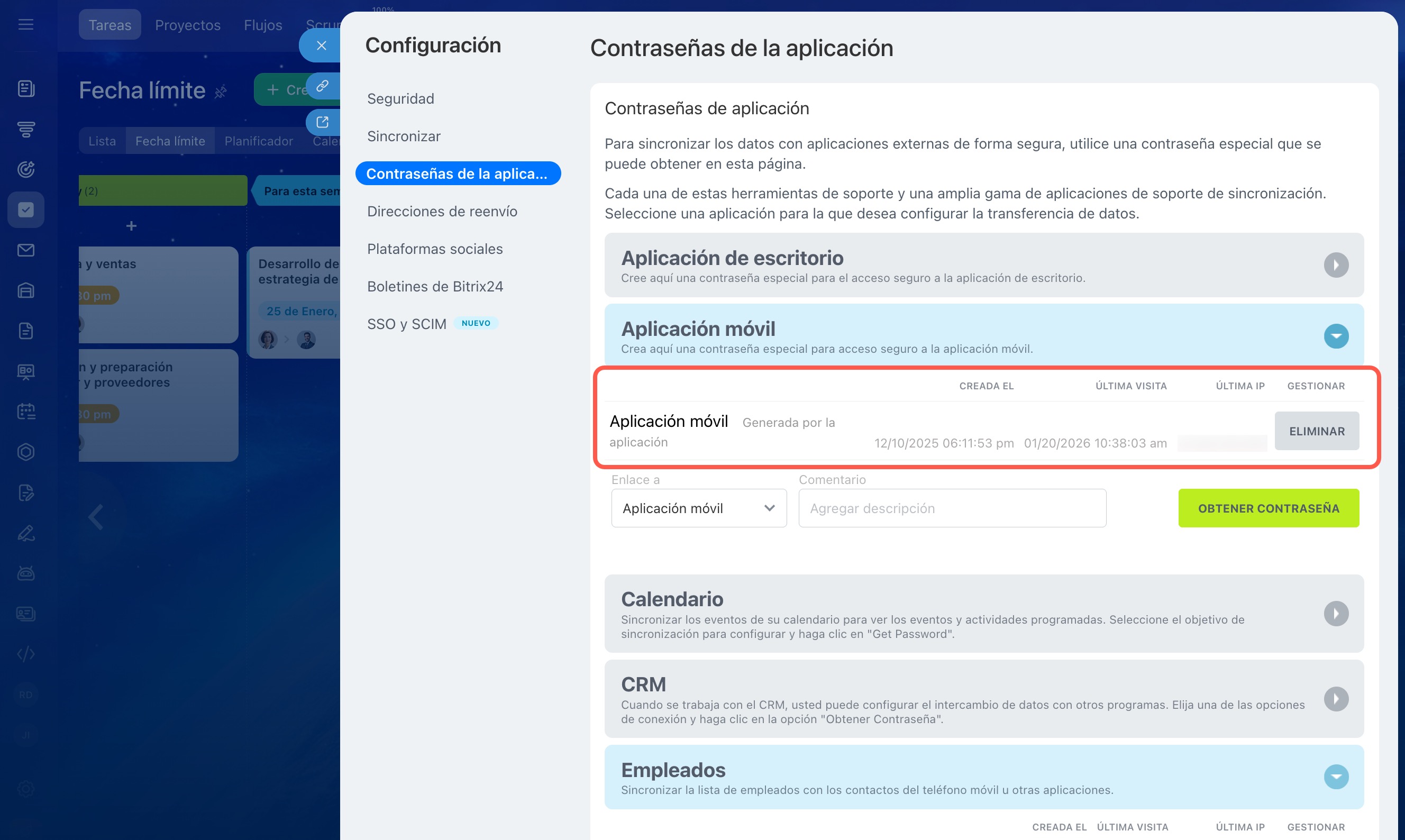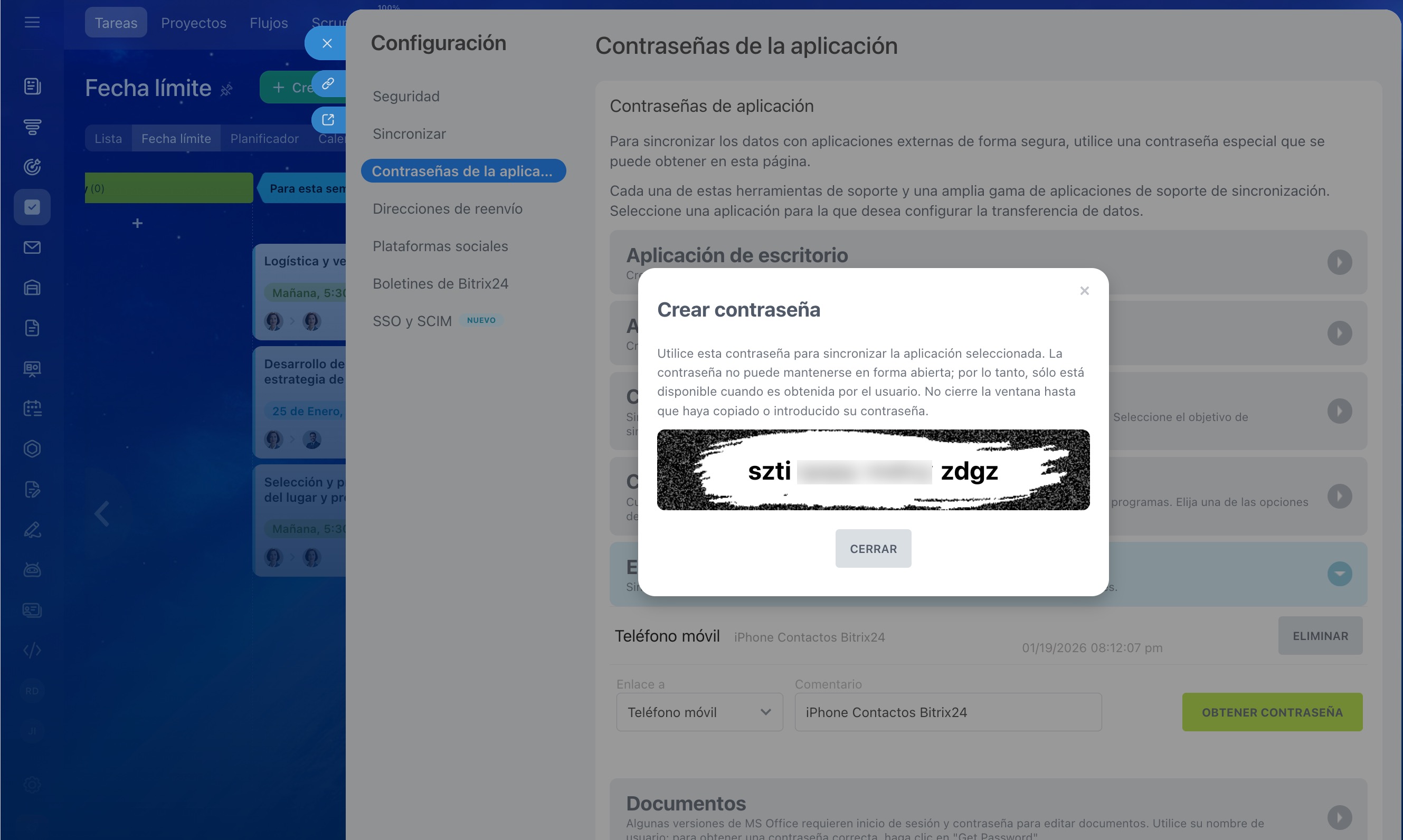 8. Haz clic en Obtener contraseña. Copia la contraseña generada y pégala en la configuración del servicio externo en lugar de la contraseña habitual de Bitrix24. A partir de ese momento, la aplicación podrá conectarse automáticamente a tu cuenta de Bitrix24.