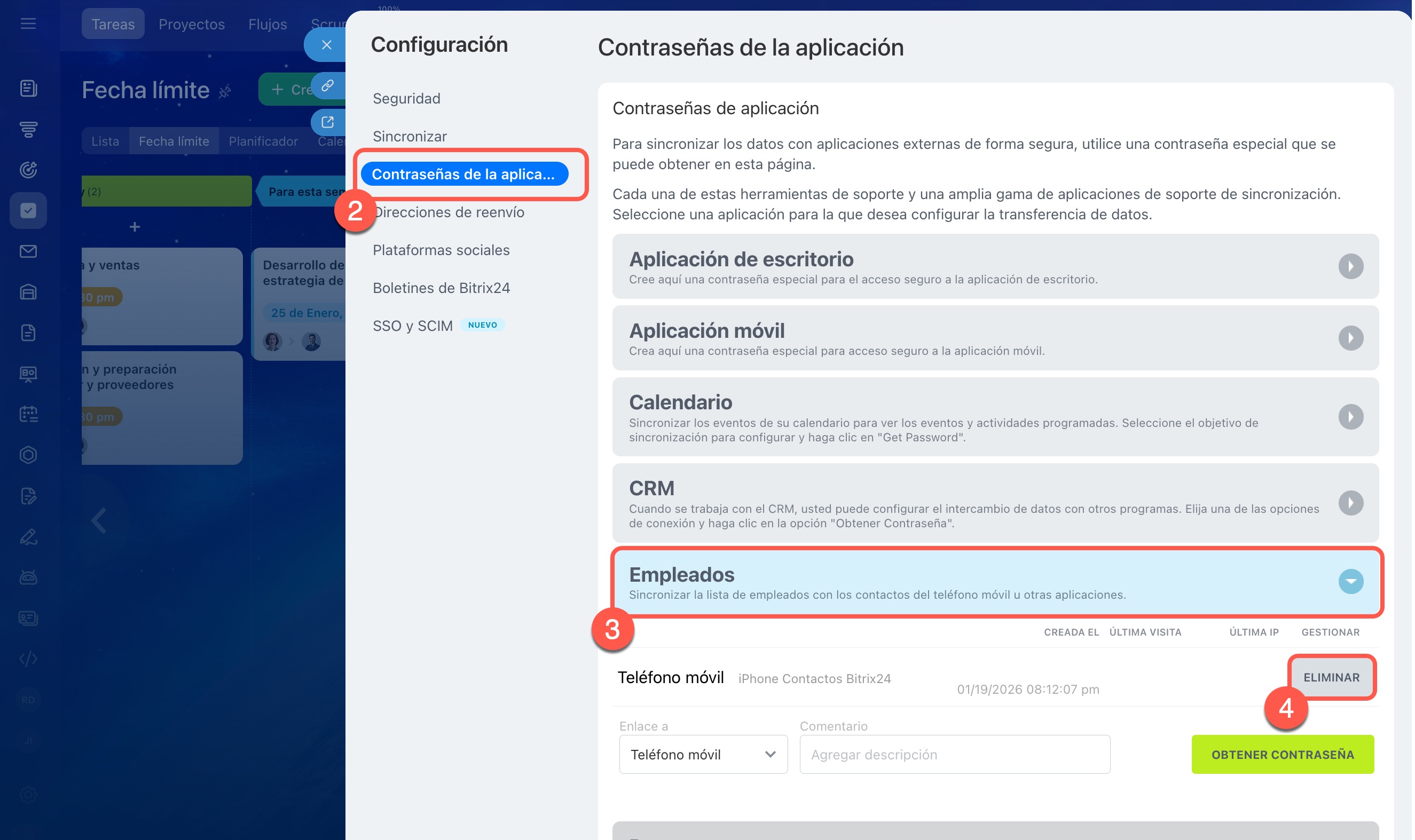 - Si tienes activada la autenticación en dos pasos en Bitrix24, el uso de contraseñas de aplicaciones es obligatorio.