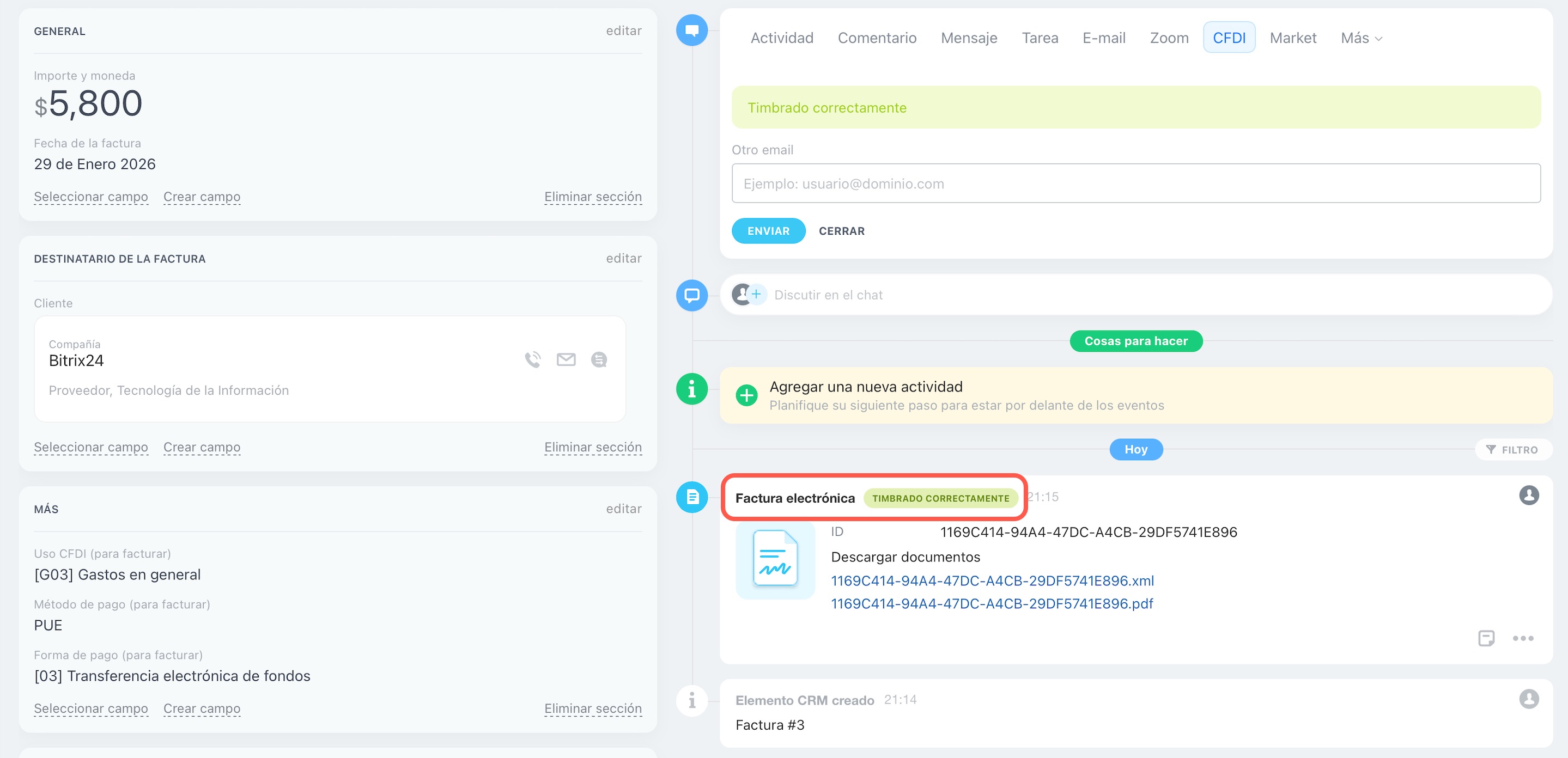 Ahora los usuarios de Bitrix24 en México pueden emitir y timbrar CFDI (Comprobante Fiscal Digital por Internet) directamente desde su CRM, gracias a la nueva aplicación Facturación electrónica (México). Esta solución está diseñada para integrar los procesos comerciales con los requisitos fiscales vigentes, optimizando la gestión de facturas y garantizando el cumplimiento con el SAT.