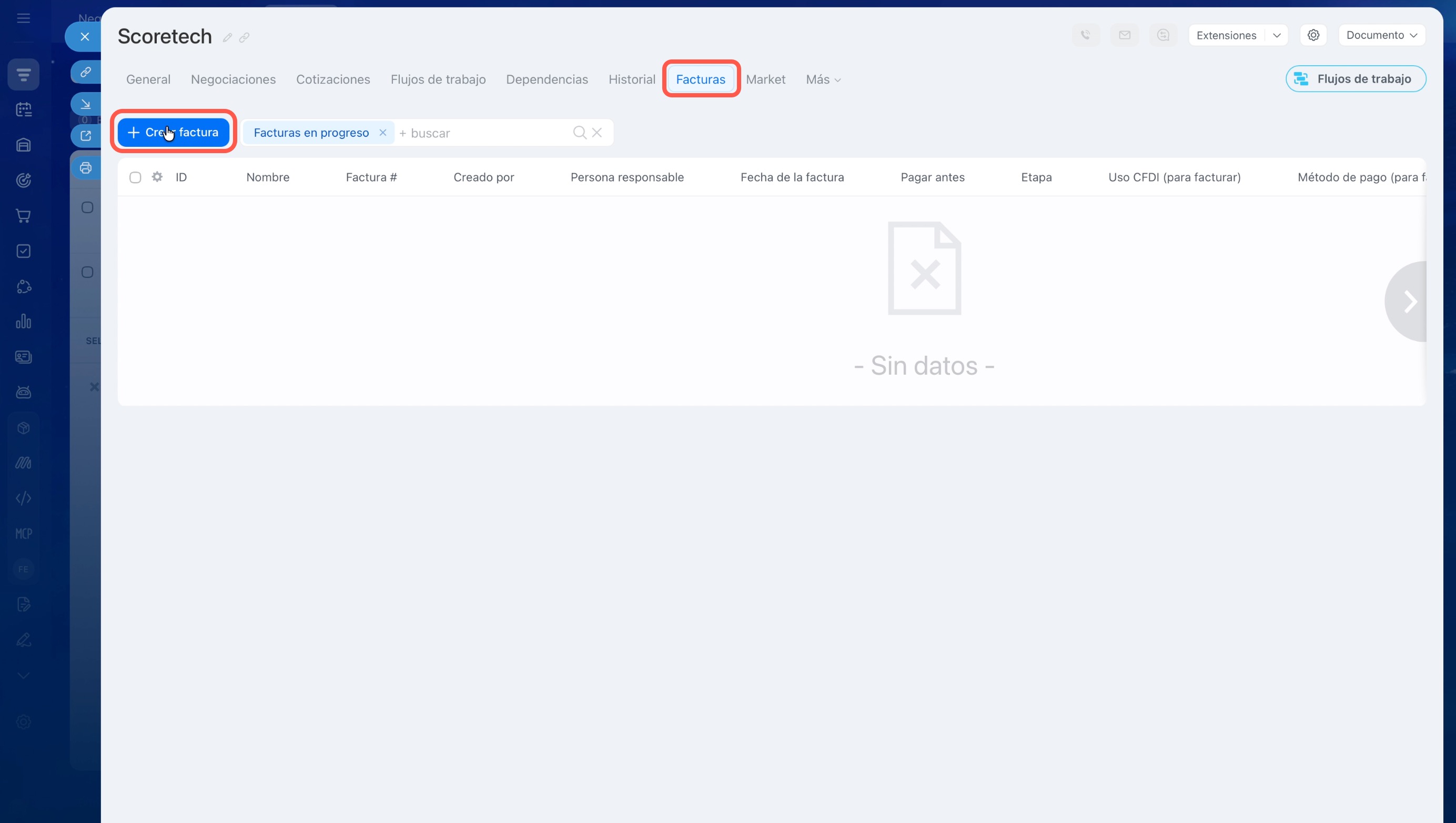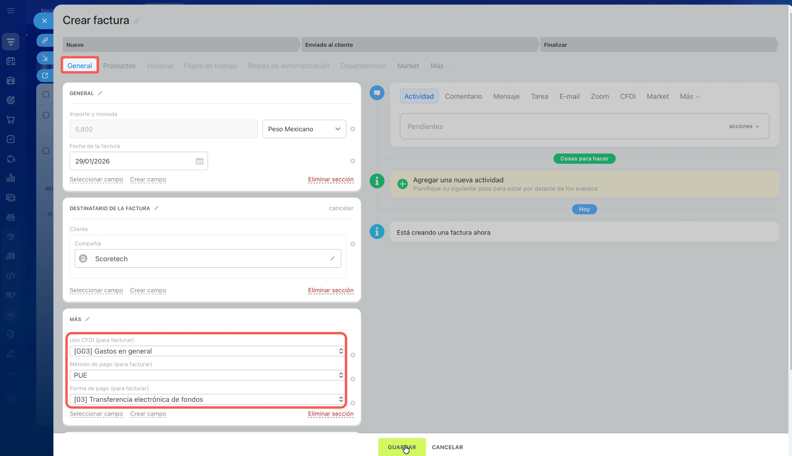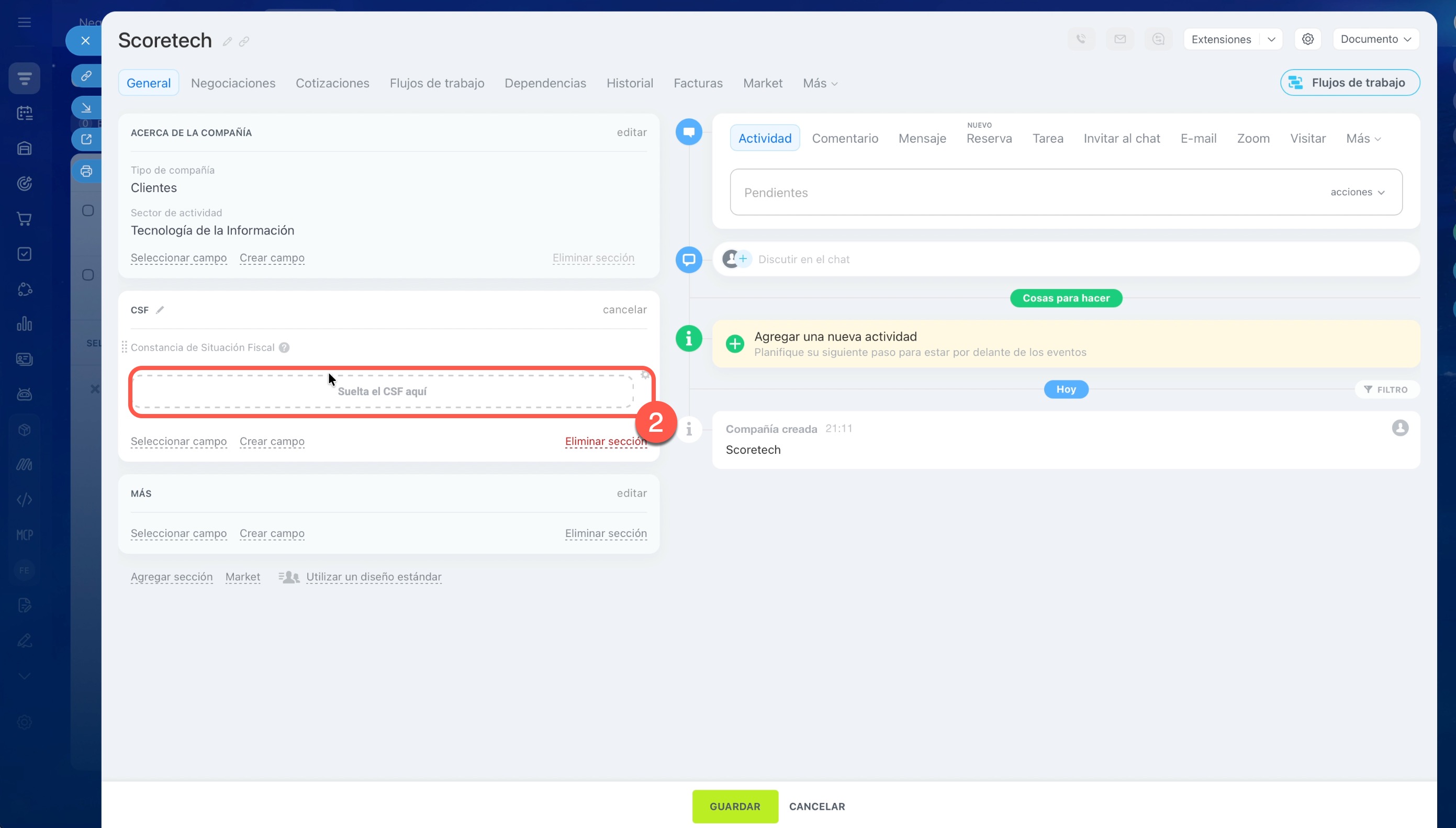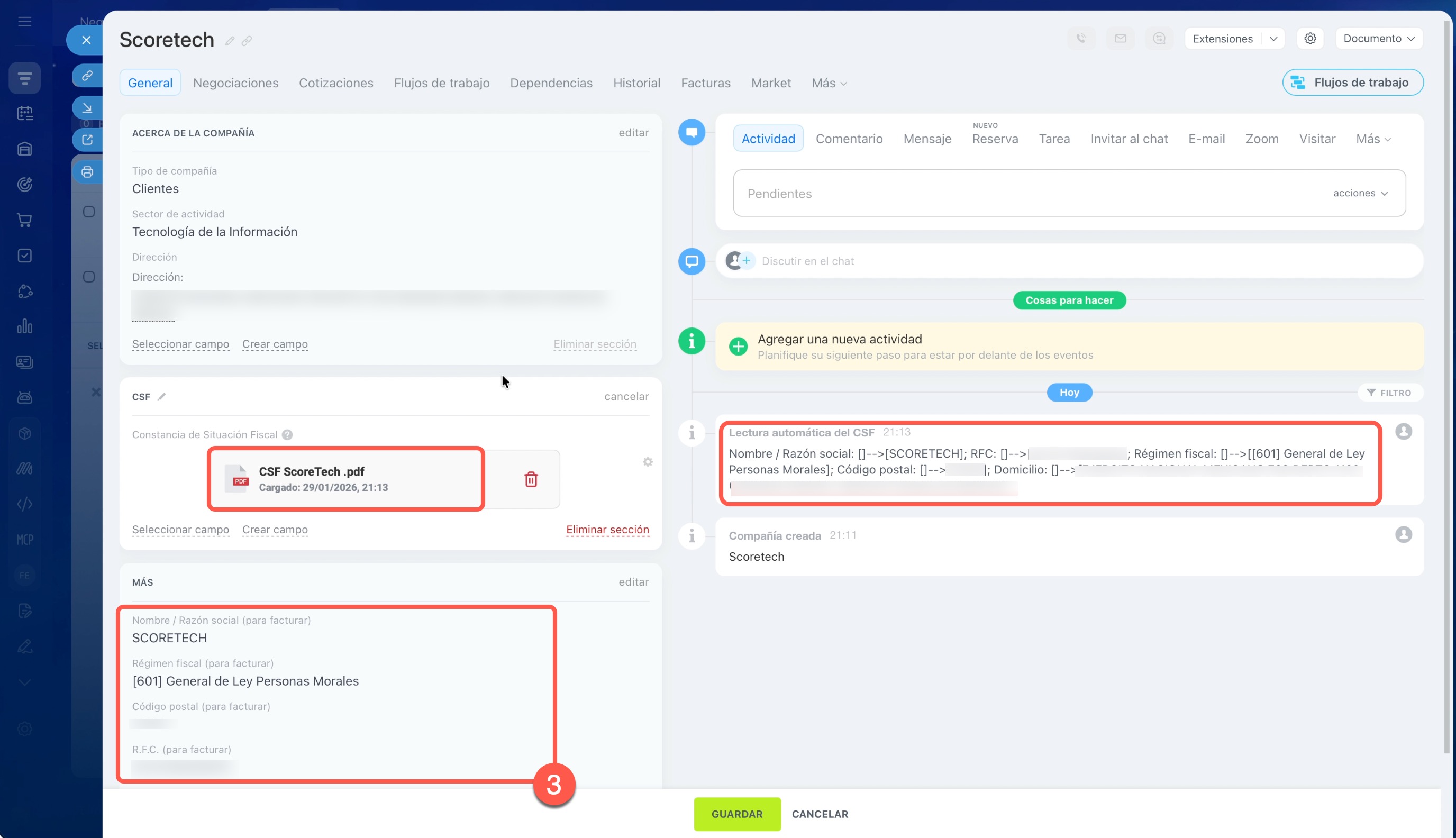 - Verifica que tengas un cliente registrado en el CRM como compañía y que hayas llenado los campos necesarios para facturar: Nombre/Razón social, RFC, Régimen fiscal y Código postal. Si facturas a una persona física, no hay problema: usa los mismos campos. Puedes completarlos manualmente o subir la Constancia de Situación Fiscal (CSF) del cliente en el campo correspondiente; al hacerlo, dichos campos se llenarán automáticamente con los datos del CSF.