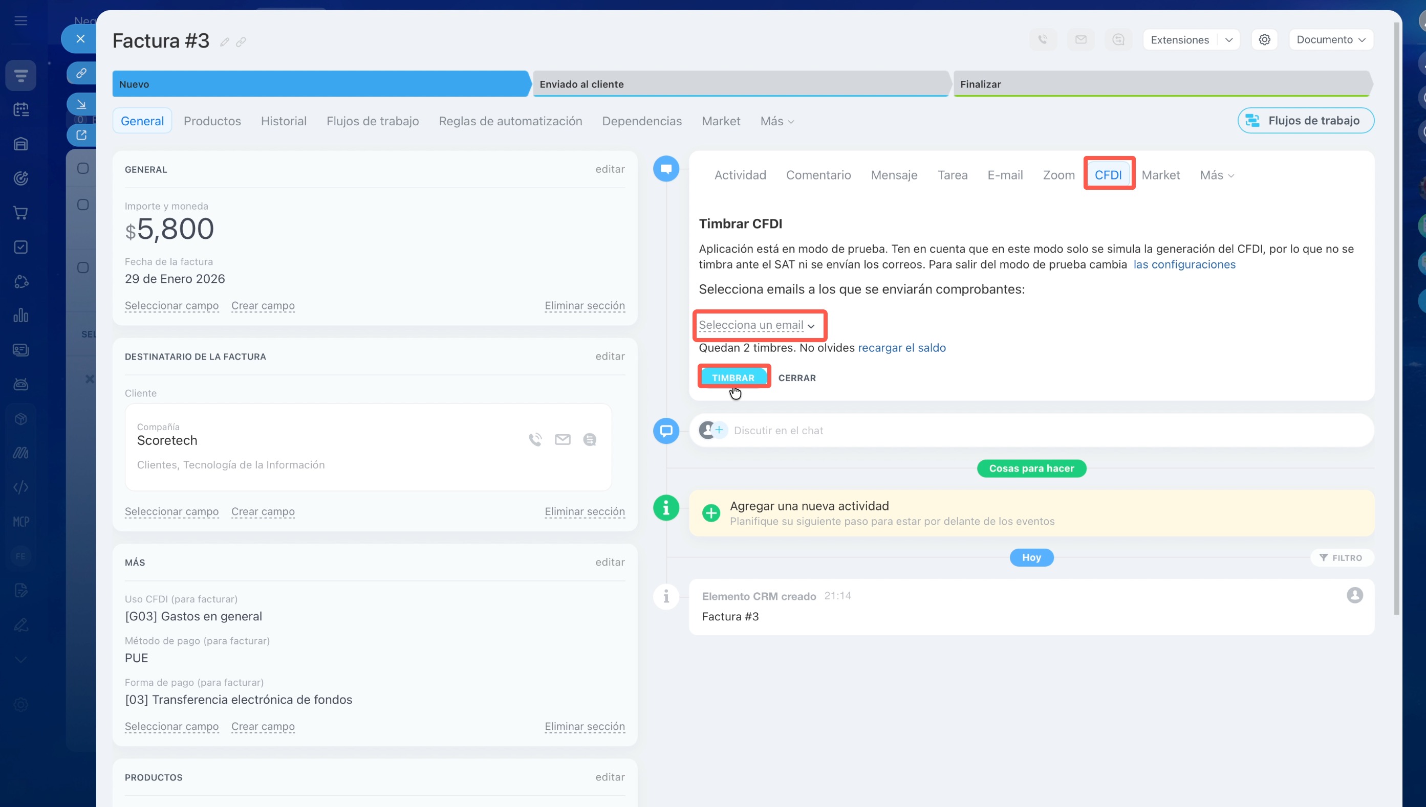 - Busca la pestaña “CFDI” en la parte superior derecha de la vista general de la factura. Antes de timbrar, la aplicación te pedirá los correos electrónicos a los que se enviará la factura (PDF y XML). Puedes seleccionarlos entre los datos registrados en el CRM para el cliente, incluidos sus contactos, o ingresarlos manualmente.
