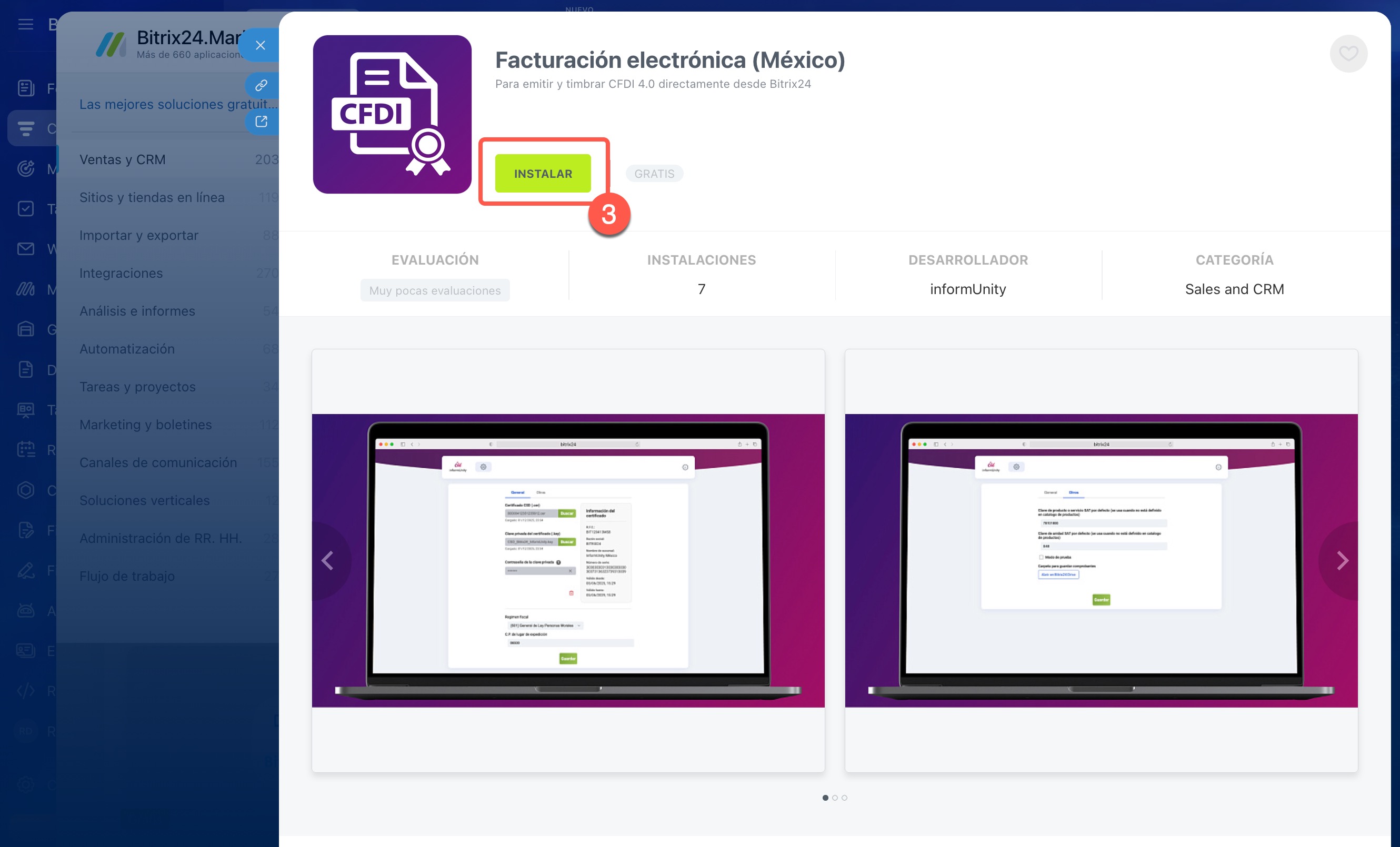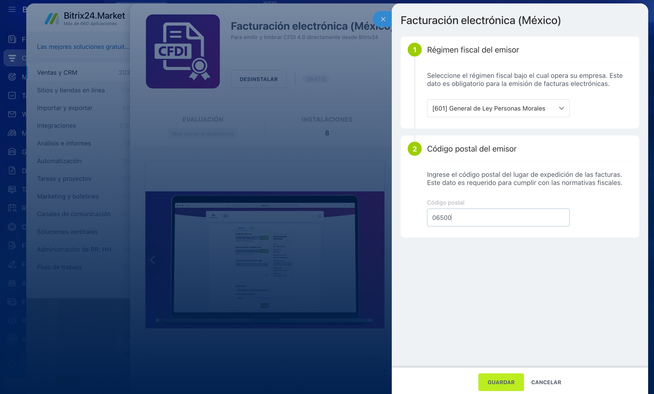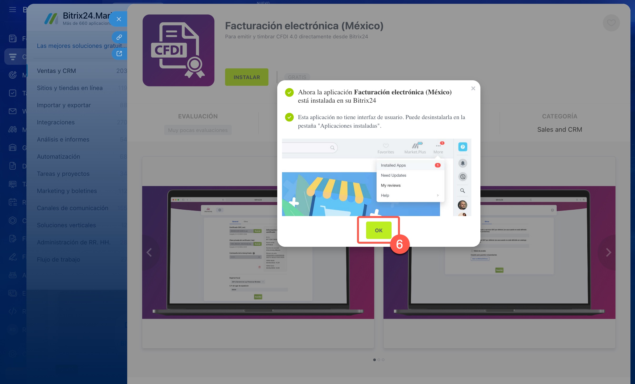 Para comenzar, instala la aplicación Facturación electrónica (México) desde Bitrix24 Market.