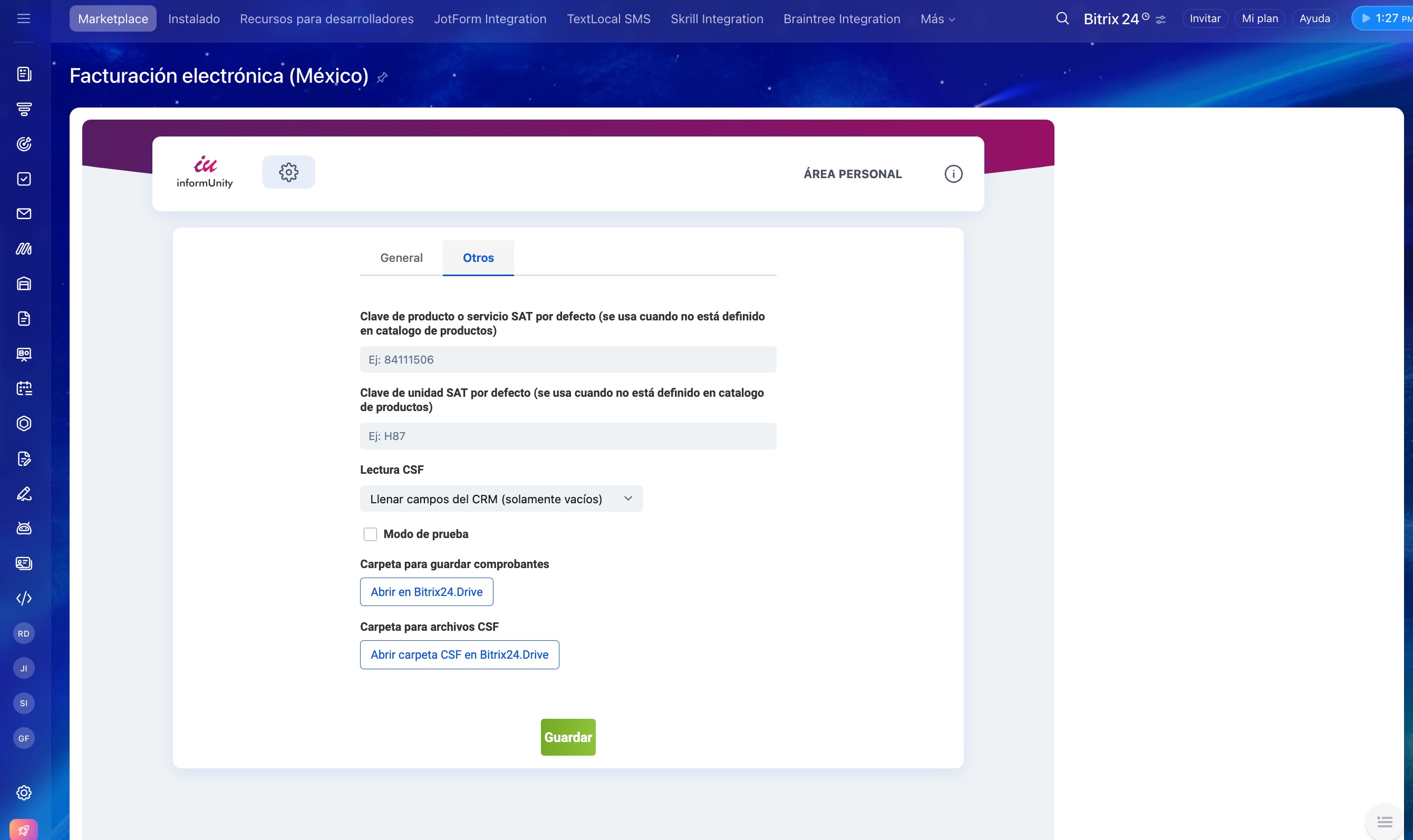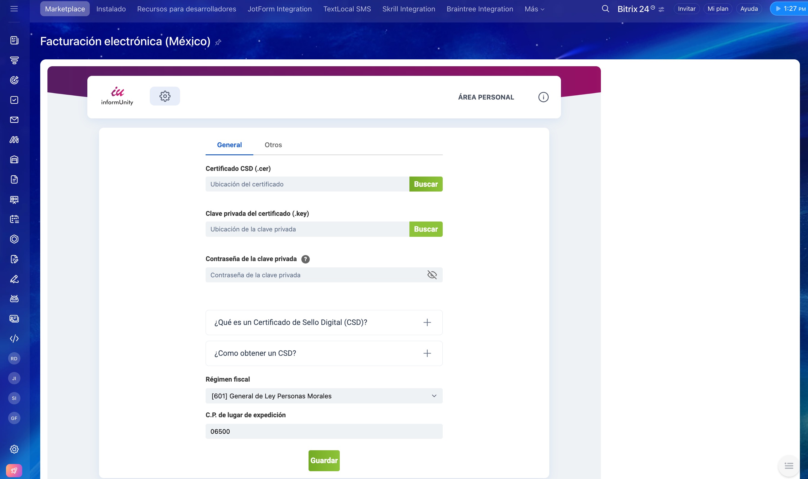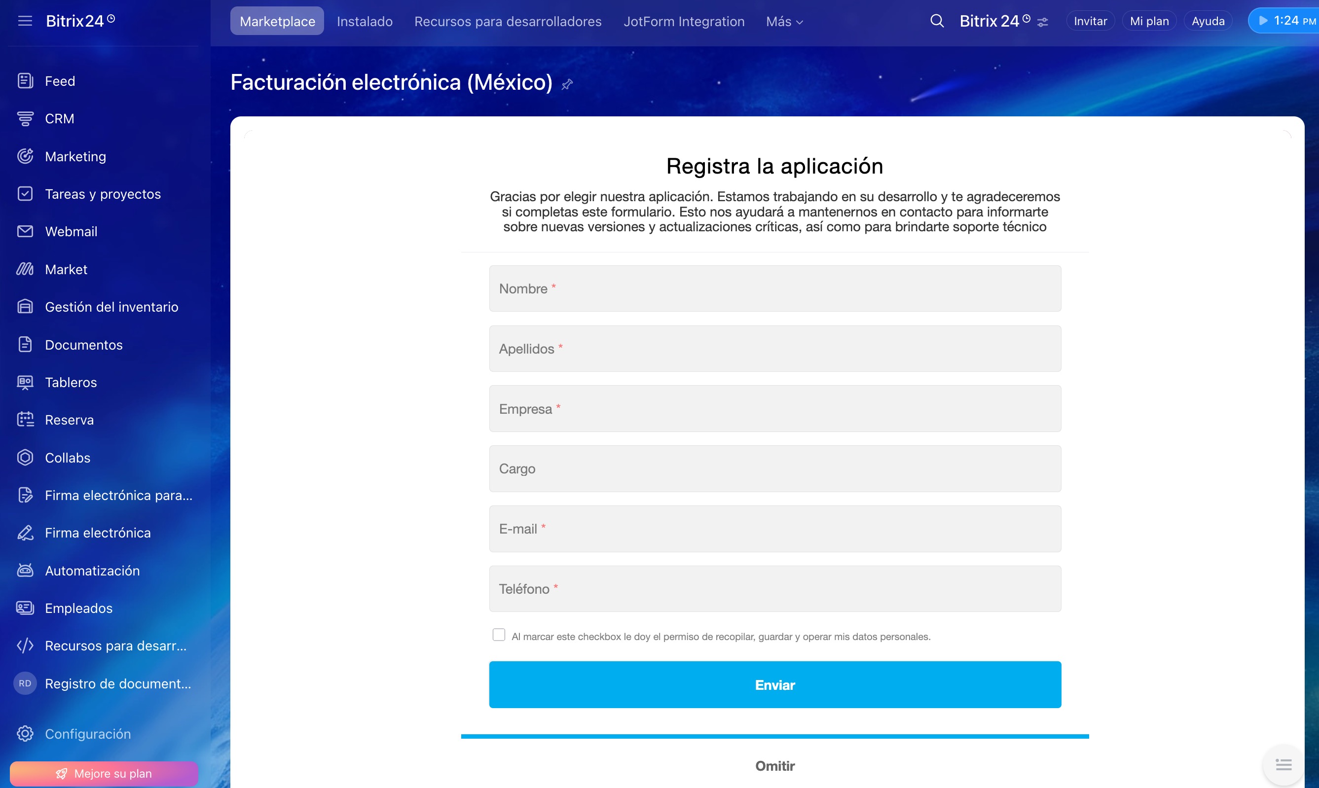 Para comenzar, instala la aplicación Facturación electrónica (México) desde Bitrix24 Market.