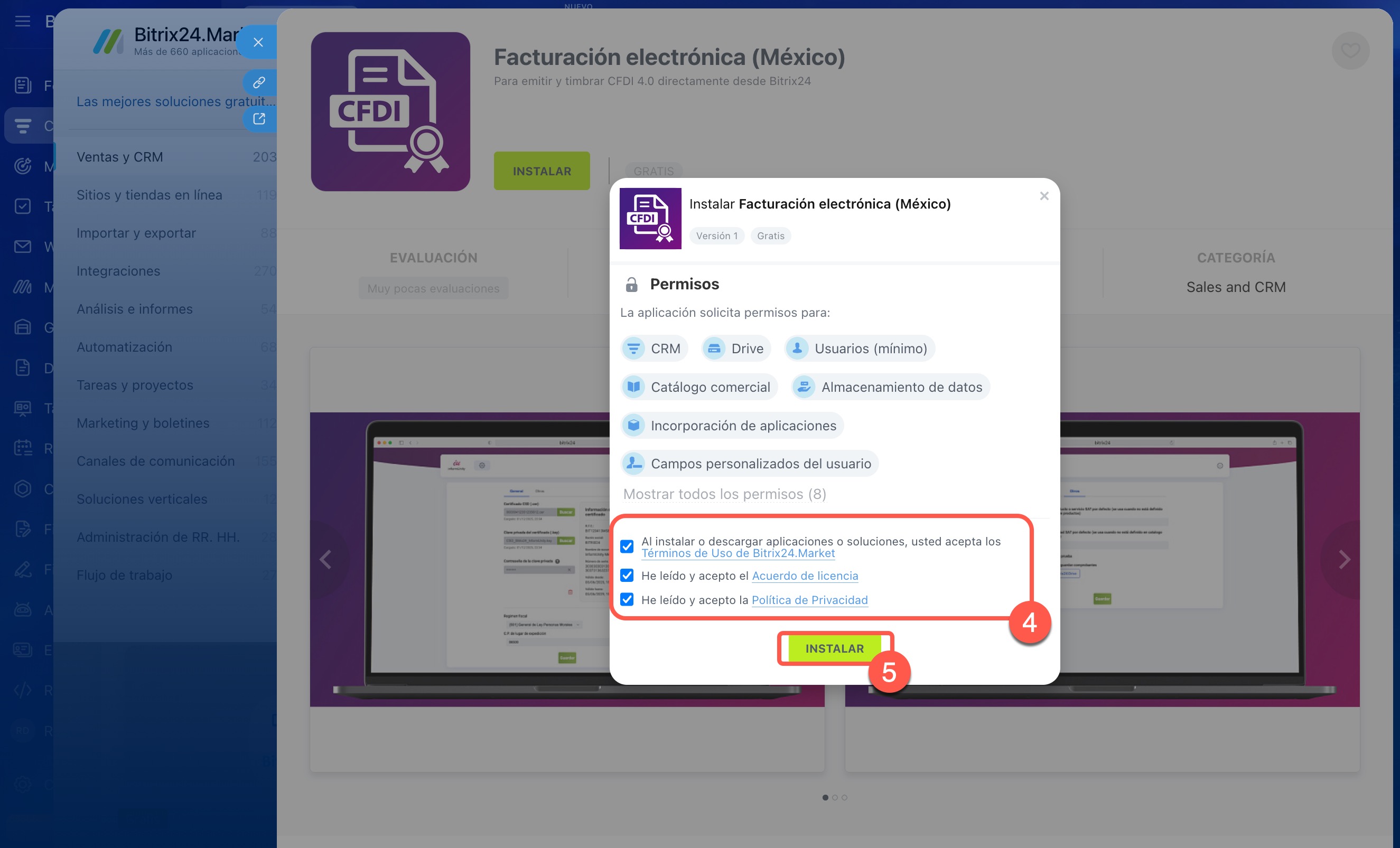 - 4-5. Lee y acepta el Acuerdo de licencia, la Política de privacidad y los Términos de uso de Bitrix24.Market, y luego haz clic en Instalar.