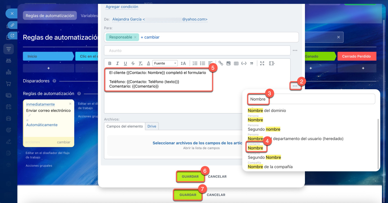 - Por último, configura la regla de automatización: define sus parámetros y añade al asunto y cuerpo del correo los valores de los campos de la ficha del CRM. Asegúrate de usar los mismos campos que en el formulario.