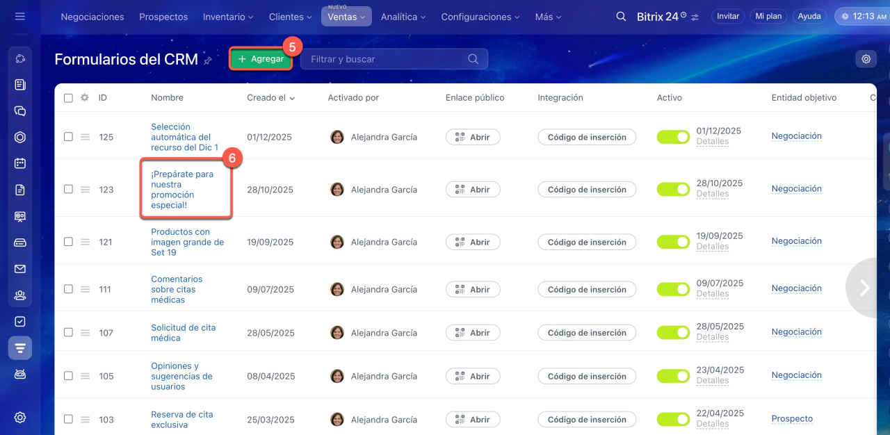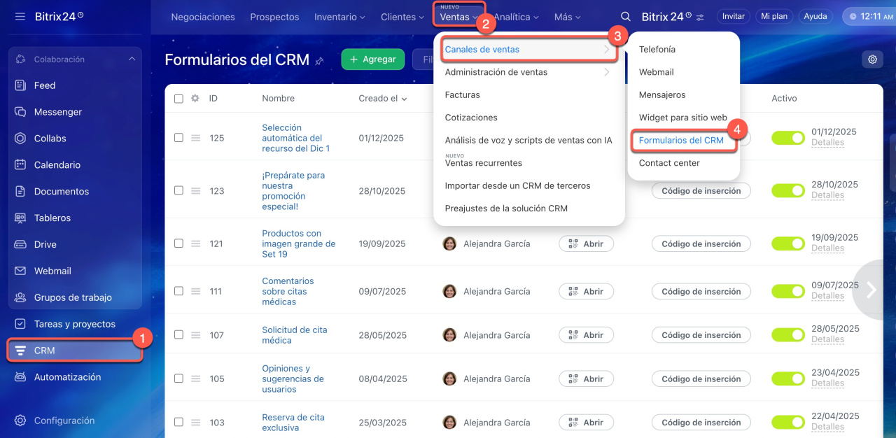 1-4. Ve a CRM > Ventas > Canales de ventas > Formularios del CRM.