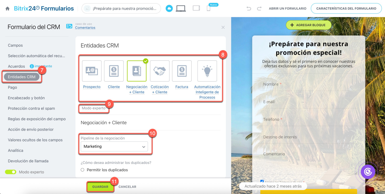 7-8. En la pestaña Entidades CRM, selecciona qué elementos se crearán en el CRM cuando un cliente complete el formulario: Prospecto, Negociación + Cliente, Cotización + Cliente, Factura o Proceso inteligente.