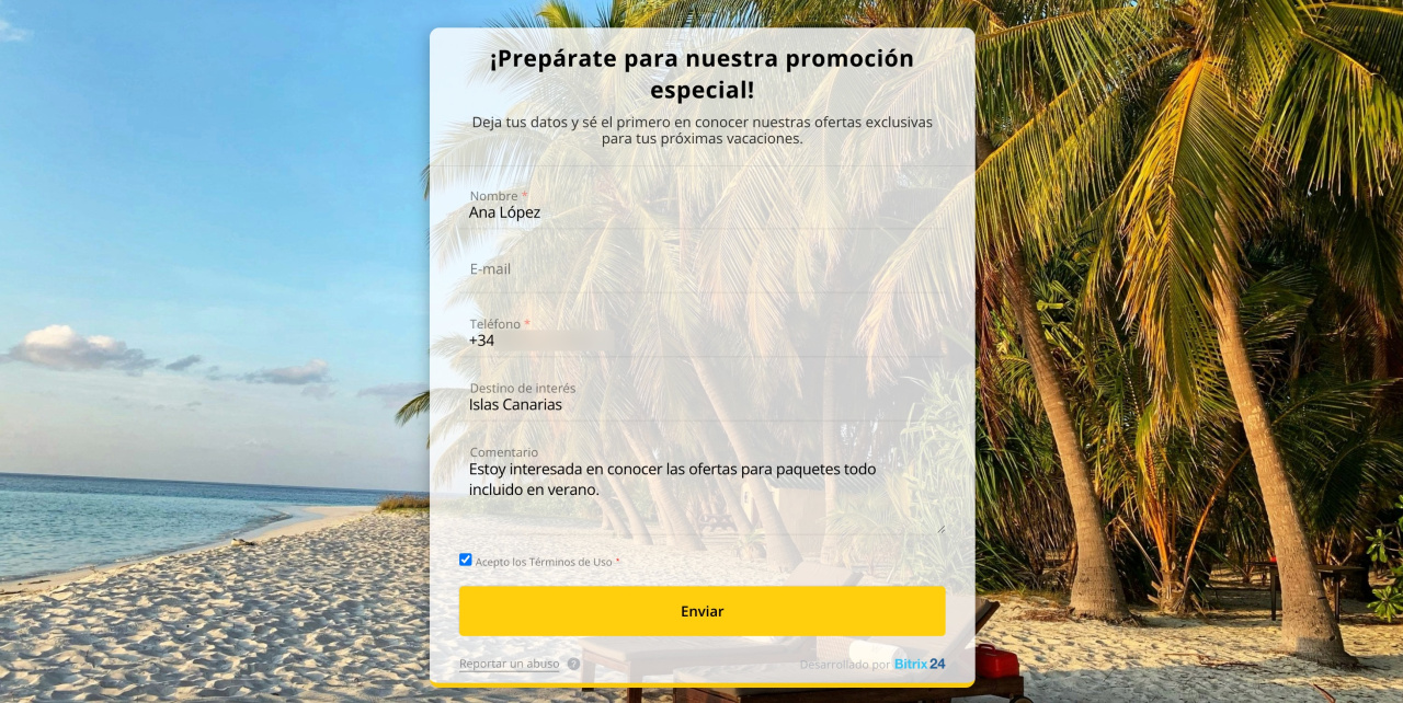 Por ejemplo, una empresa instaladora de ventanas de PVC puede lanzar una promoción como "Medición el mismo día". Los clientes completan un formulario del CRM, y sus datos se envían automáticamente al correo del gerente, que revisa la información y organiza la visita de un especialista.