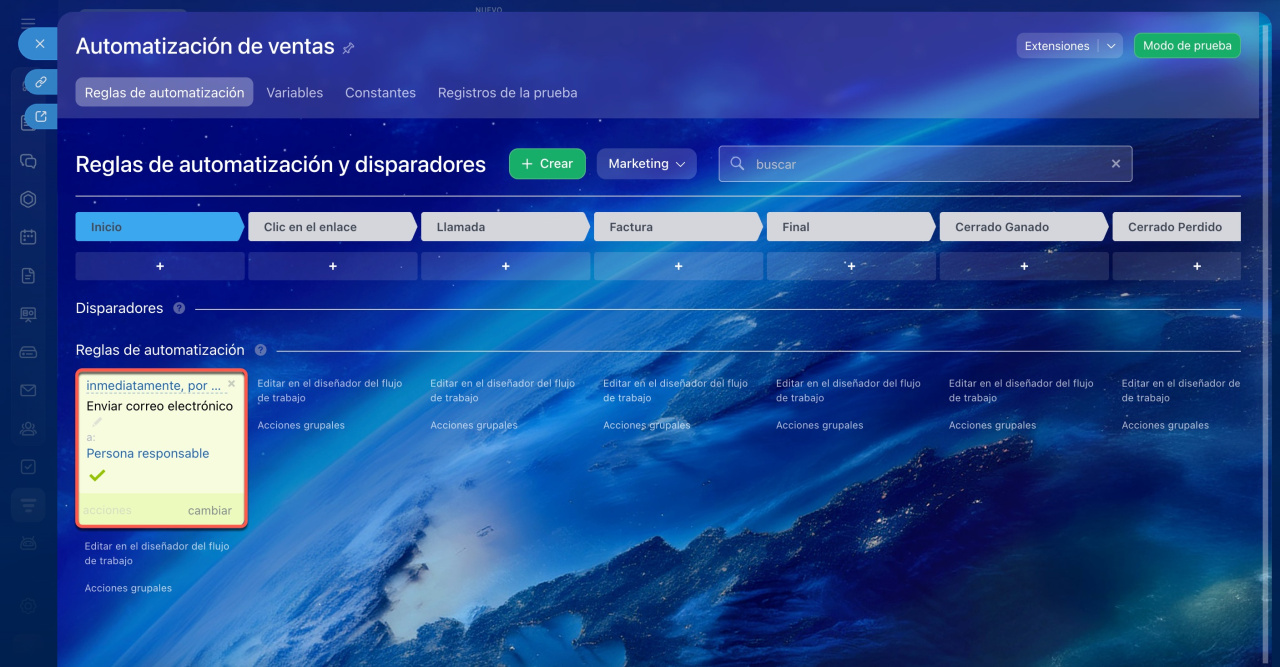 Para enviar automáticamente datos de formularios del CRM al correo de un empleado, utiliza las reglas de automatización. Estas reglas deben configurarse en el tipo de elemento del CRM que se crea al completar el formulario. Por ejemplo, si quieres enviar datos de formularios que generan negociaciones, configura la regla de automatización en el apartado de negociaciones.