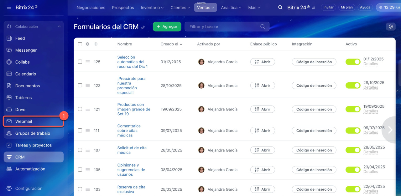- En Bitrix24 puedes configurar el envío automático de datos desde cualquier formulario del CRM a tu correo o al de tus colegas. Esto te ayuda a no pasar por alto solicitudes prioritarias y a responder sin necesidad de acceder al CRM.