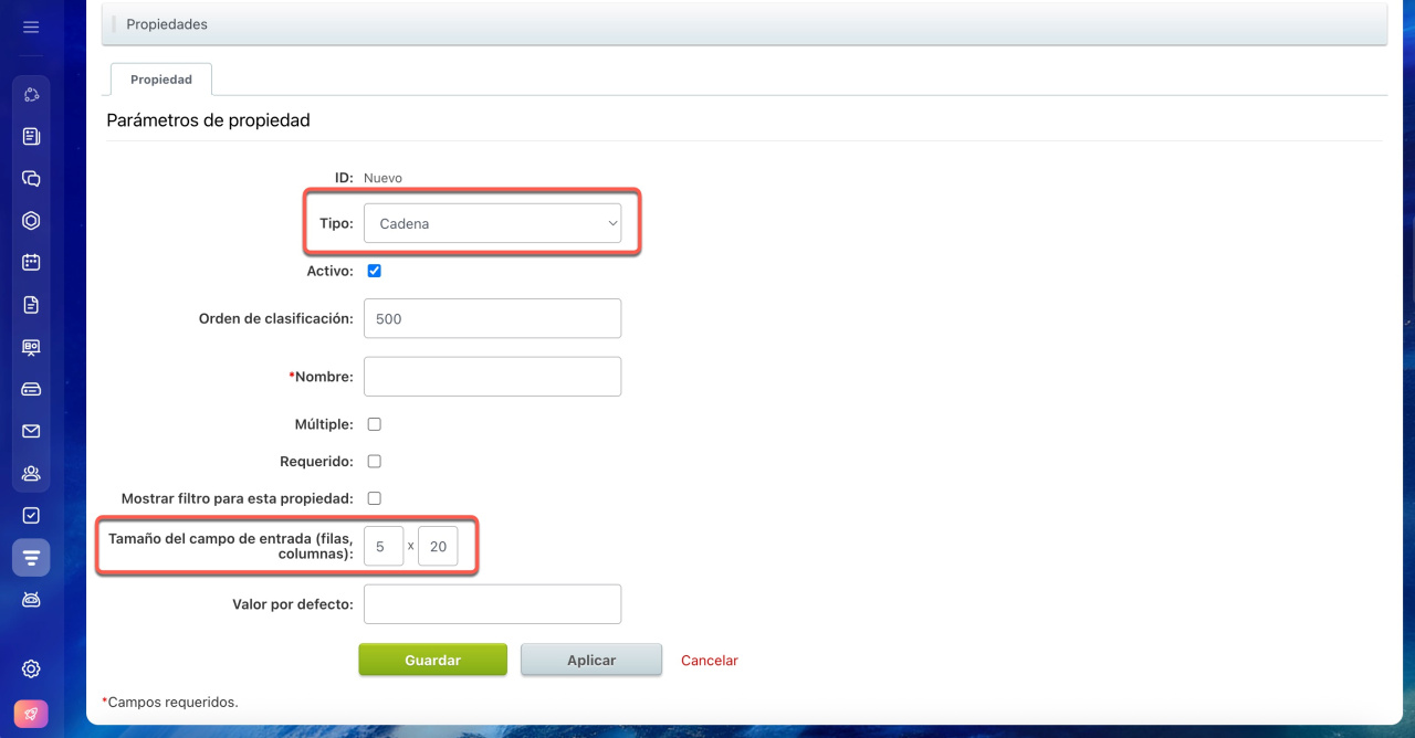 Cadena. La opción Tamaño del campo (filas, columnas) define la altura y el ancho del campo. Por ejemplo, un valor de 5 × 20 crea un campo más alto, ideal para descripciones largas.