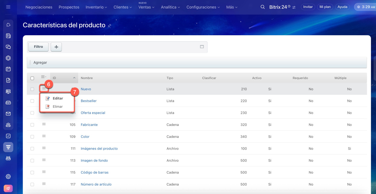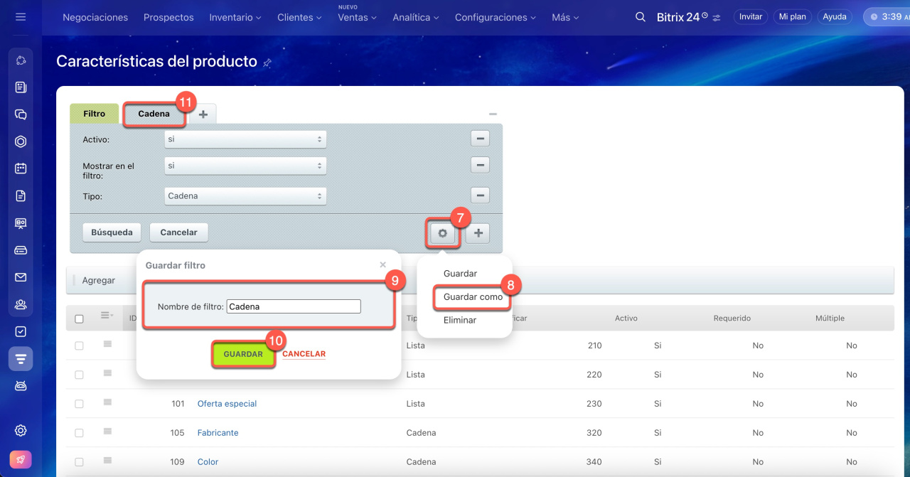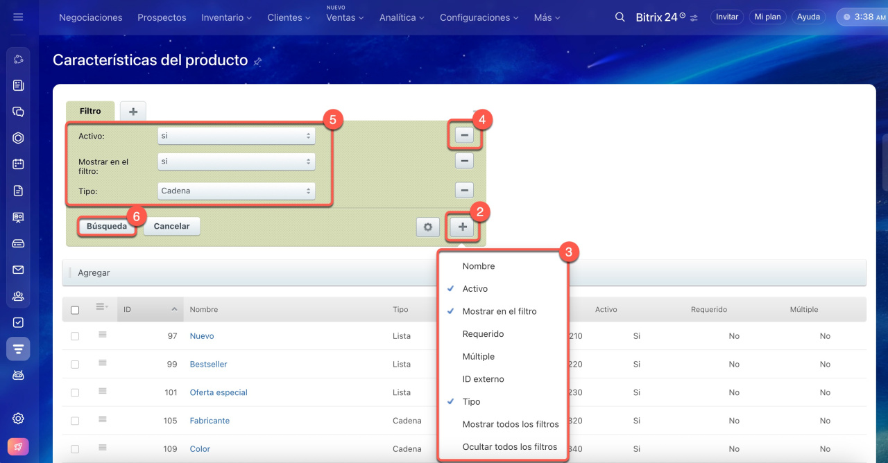Desde la ficha del producto se pueden configurar menos parámetros que en la configuración general del CRM. Este método es útil para añadir rápidamente una propiedad y habilitarla en el filtro de la tienda online de Bitrix24.