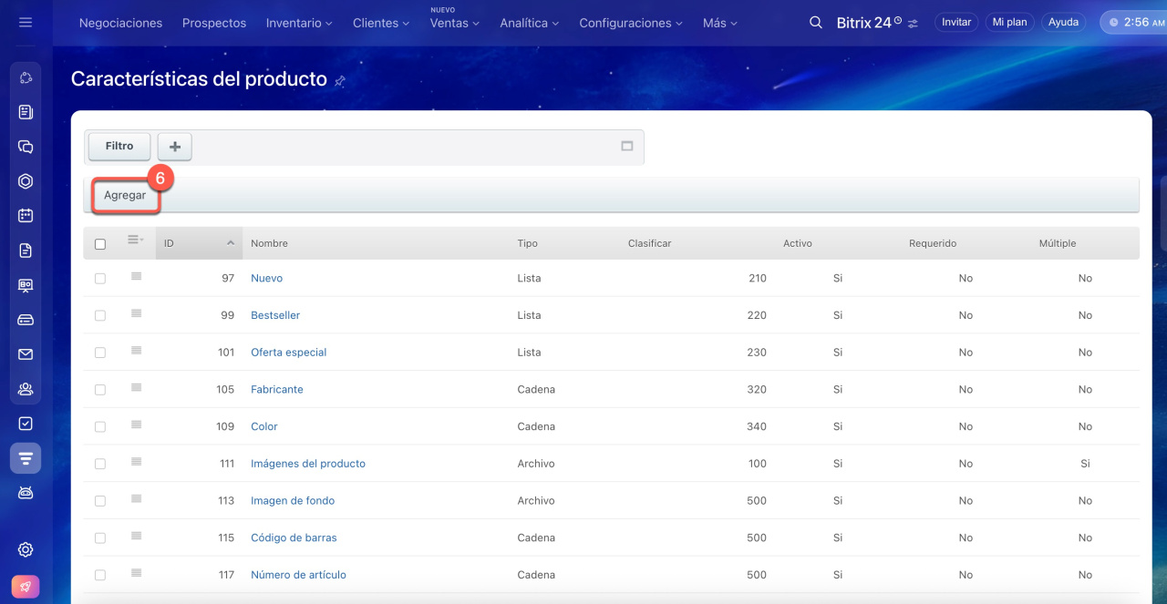 - Para añadir una nueva propiedad desde la configuración del CRM, ve a CRM > Configuraciones > Configuración CRM > Punto de partida > Propiedades de productos > Agregar. Configura los parámetros y guarda los cambios.