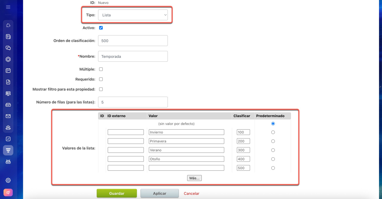 - Orden de clasificación: define la posición de la propiedad en la lista. Un número menor la situará más arriba. Por ejemplo, "Material" con valor 100 aparecerá antes que "Código" con valor 200.