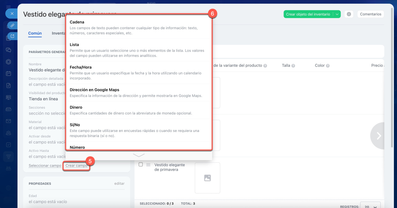 4-6. Abre la ficha de un producto, haz clic en Crear campo y selecciona su tipo.