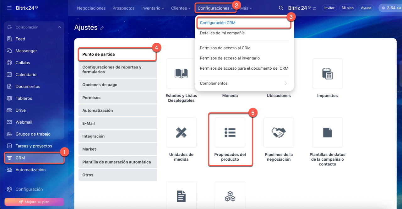 1-5. Ve a CRM > Configuraciones > Configuración CRM > Punto de partida > Propiedades de productos.